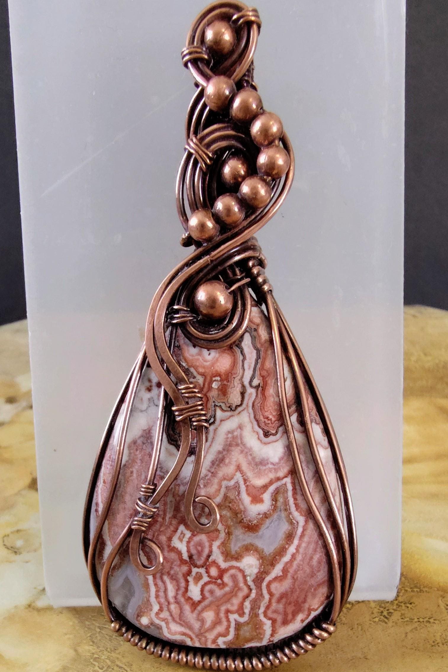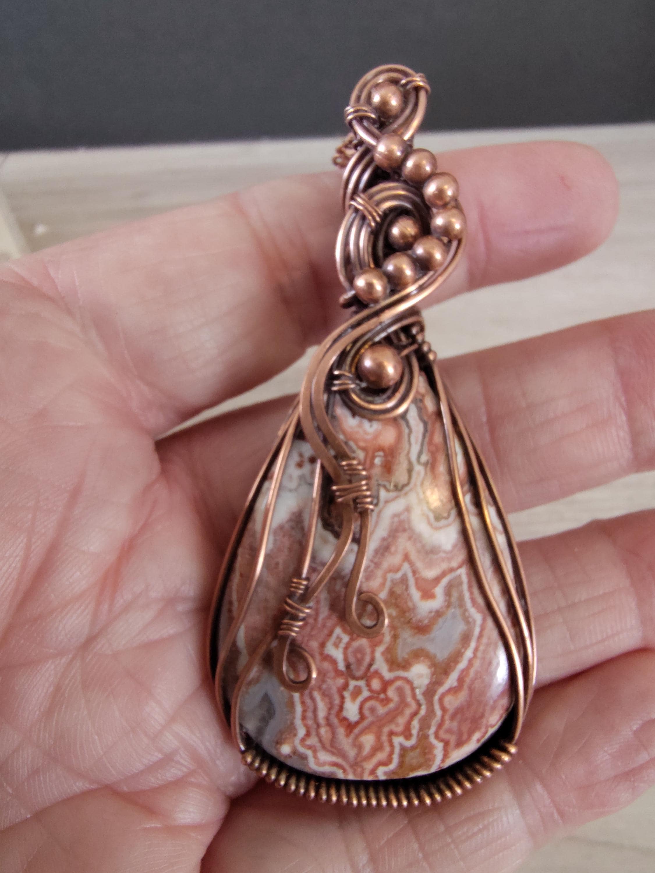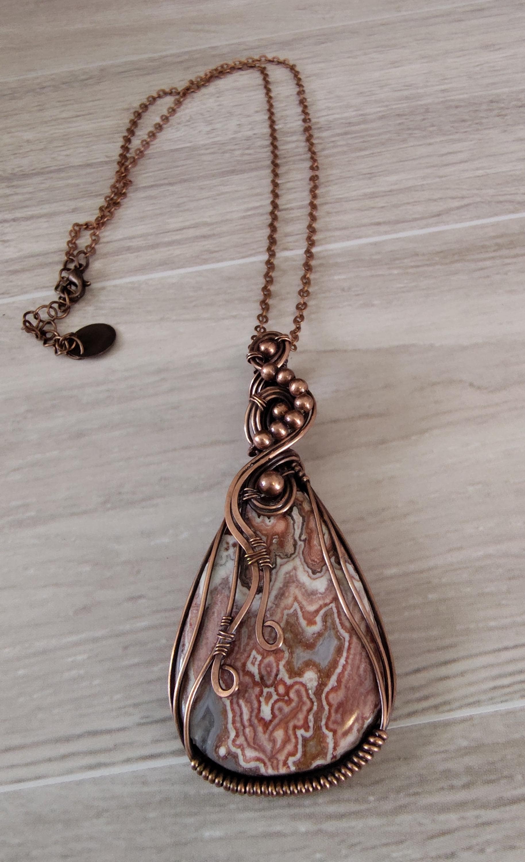 This beautiful statement Crazy Lace Agate pendant is 70mm x 32mm including wire and gemstone and includes a 45mm x 28mm teardrop shaped crazy lace agate with browns, white and rust colors. It is artistically wrapped in copper wire which has been oxidized (for an antique look), hand polished and sealed to prevent further oxidation and guard against skin discoloration.