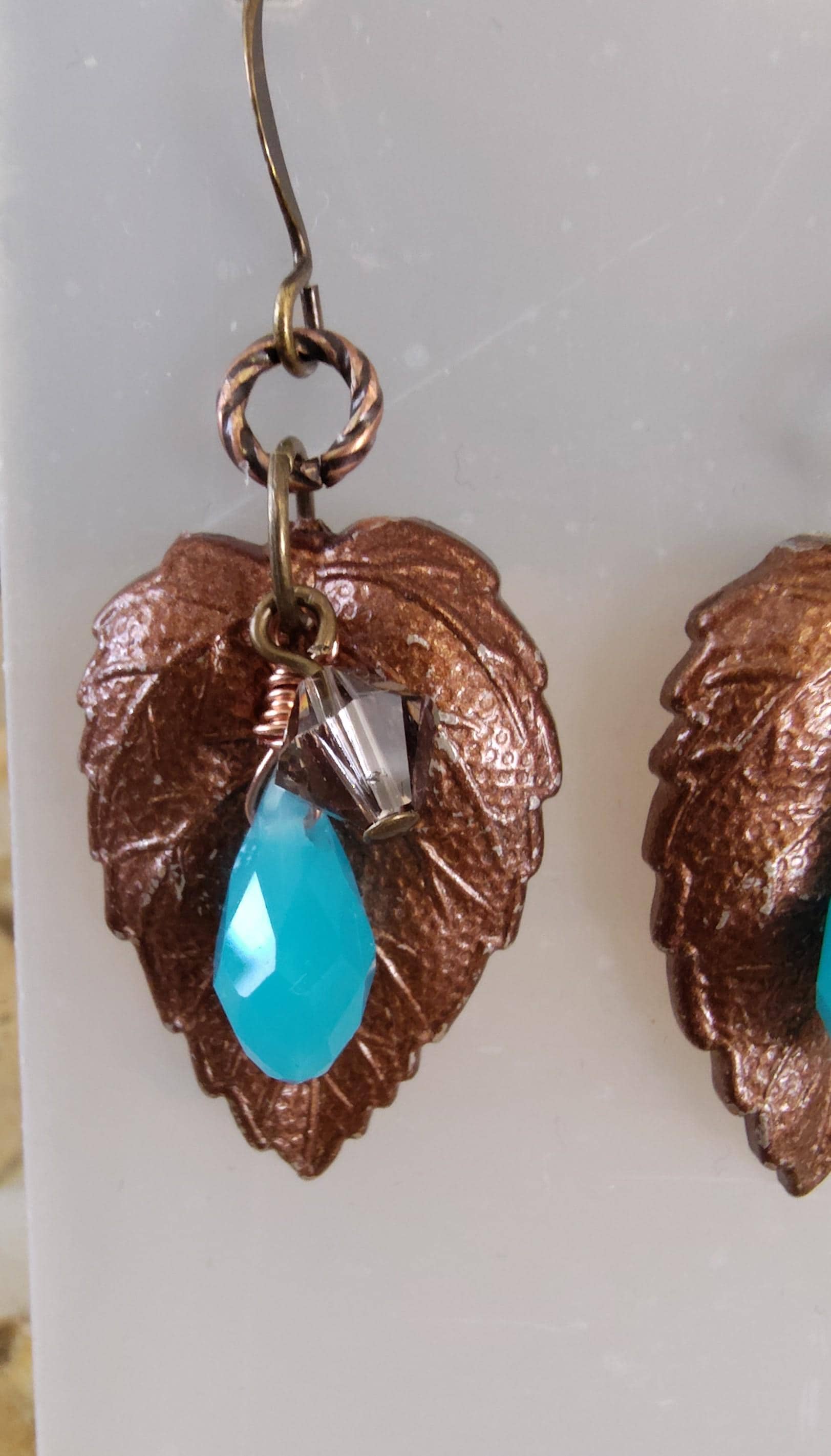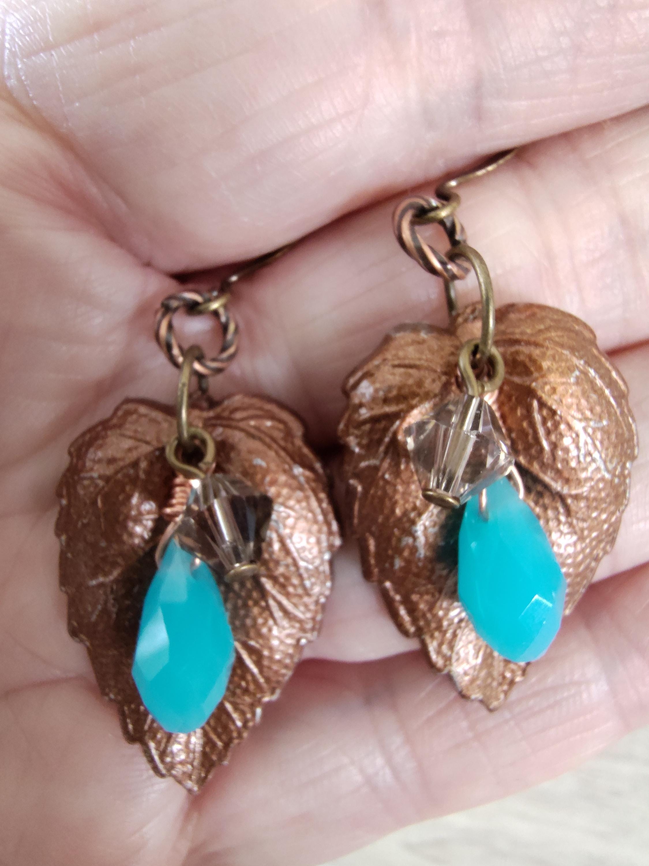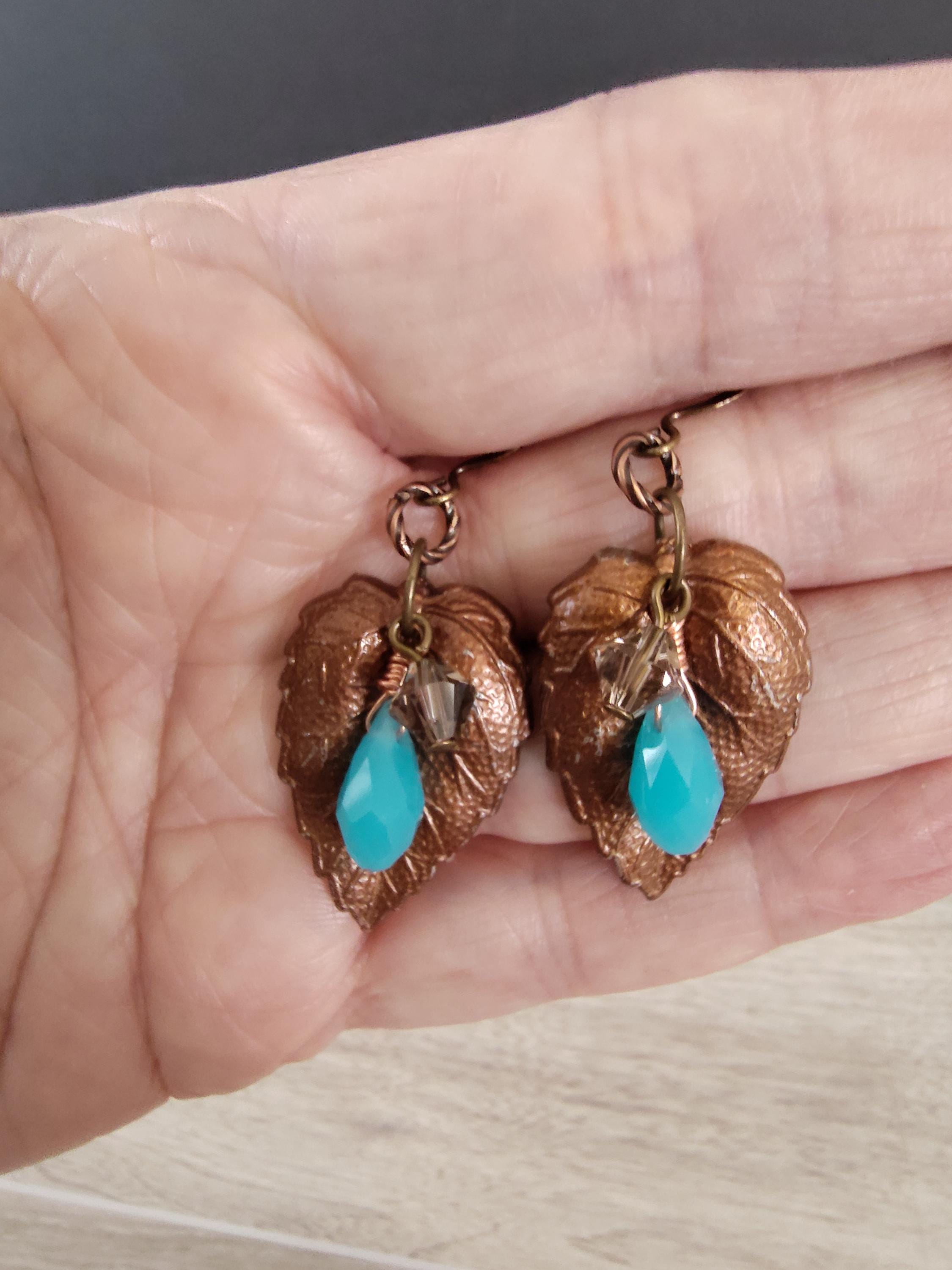 These earrings are 1 1/4" long and 3/4" wide and include copper vintage leaves, 13x5mm blue faceted Chaldedony briolettes and 6mm taupe Swarovski bicones.