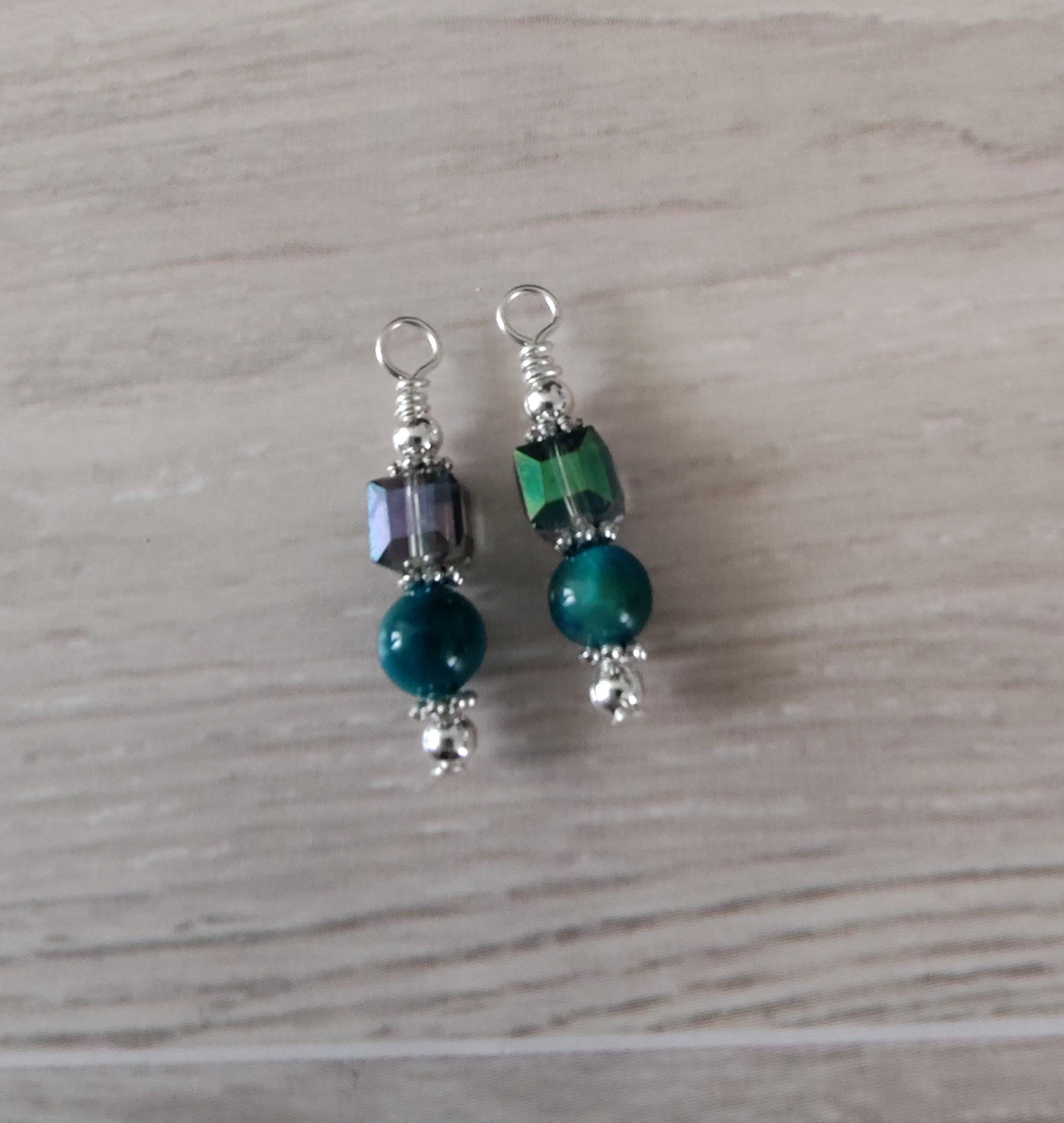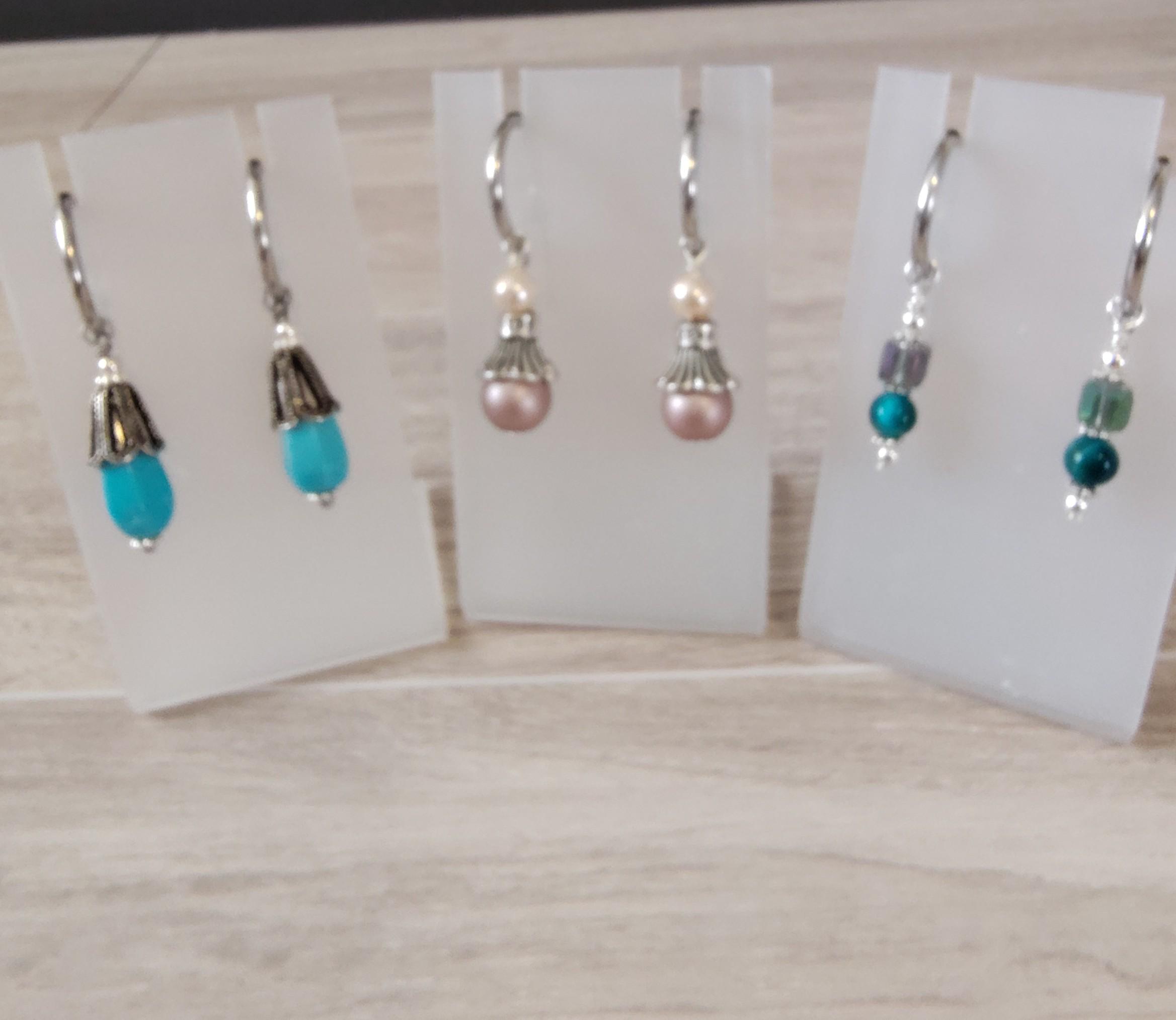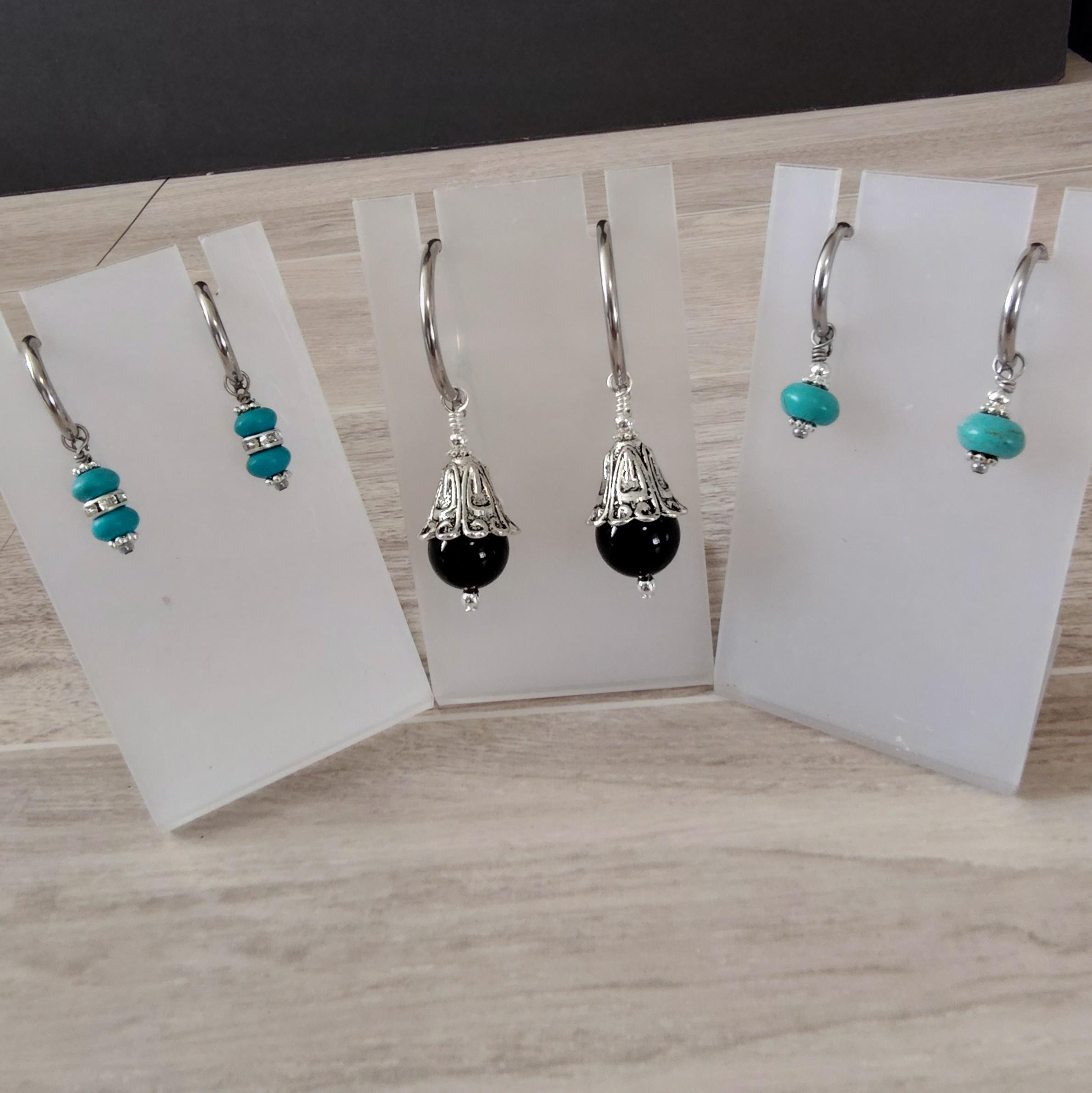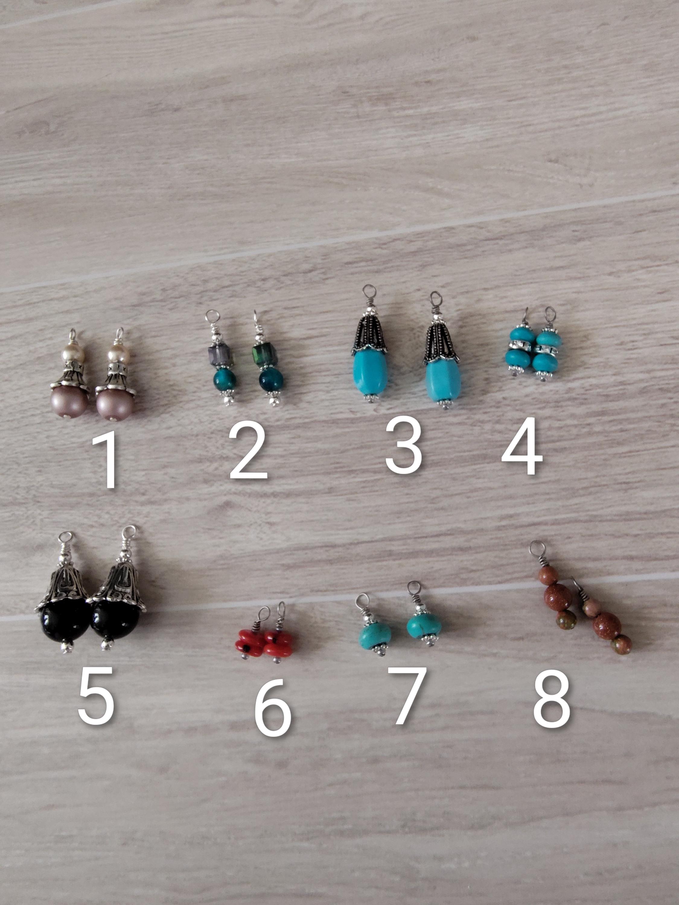 Several pairs of interchangeable earrings using semi-precious gemstones, Preciosa Pearls and glass beads and they are designed to be used with hoop earrings. I will be adding new earring sets regularly.