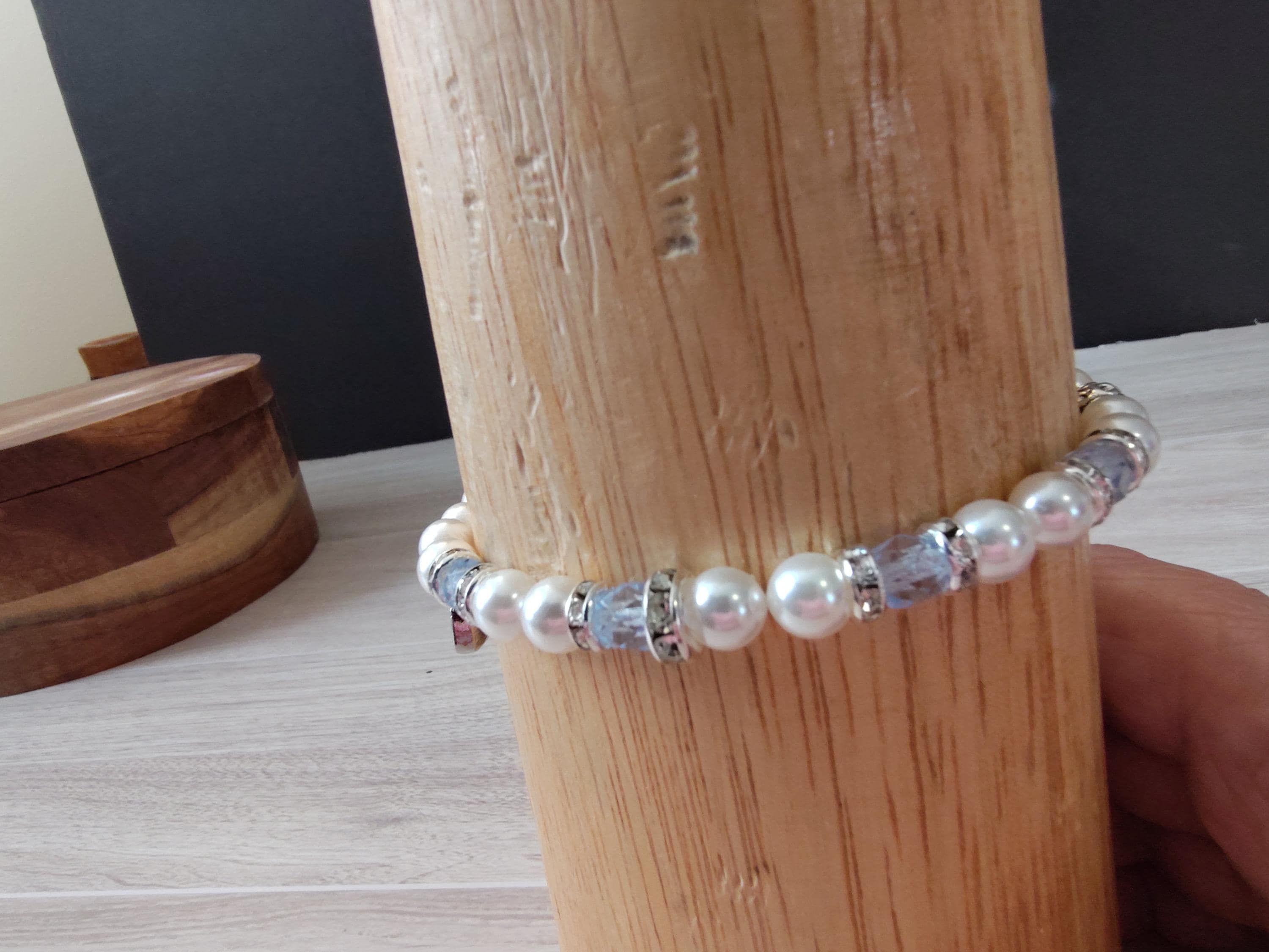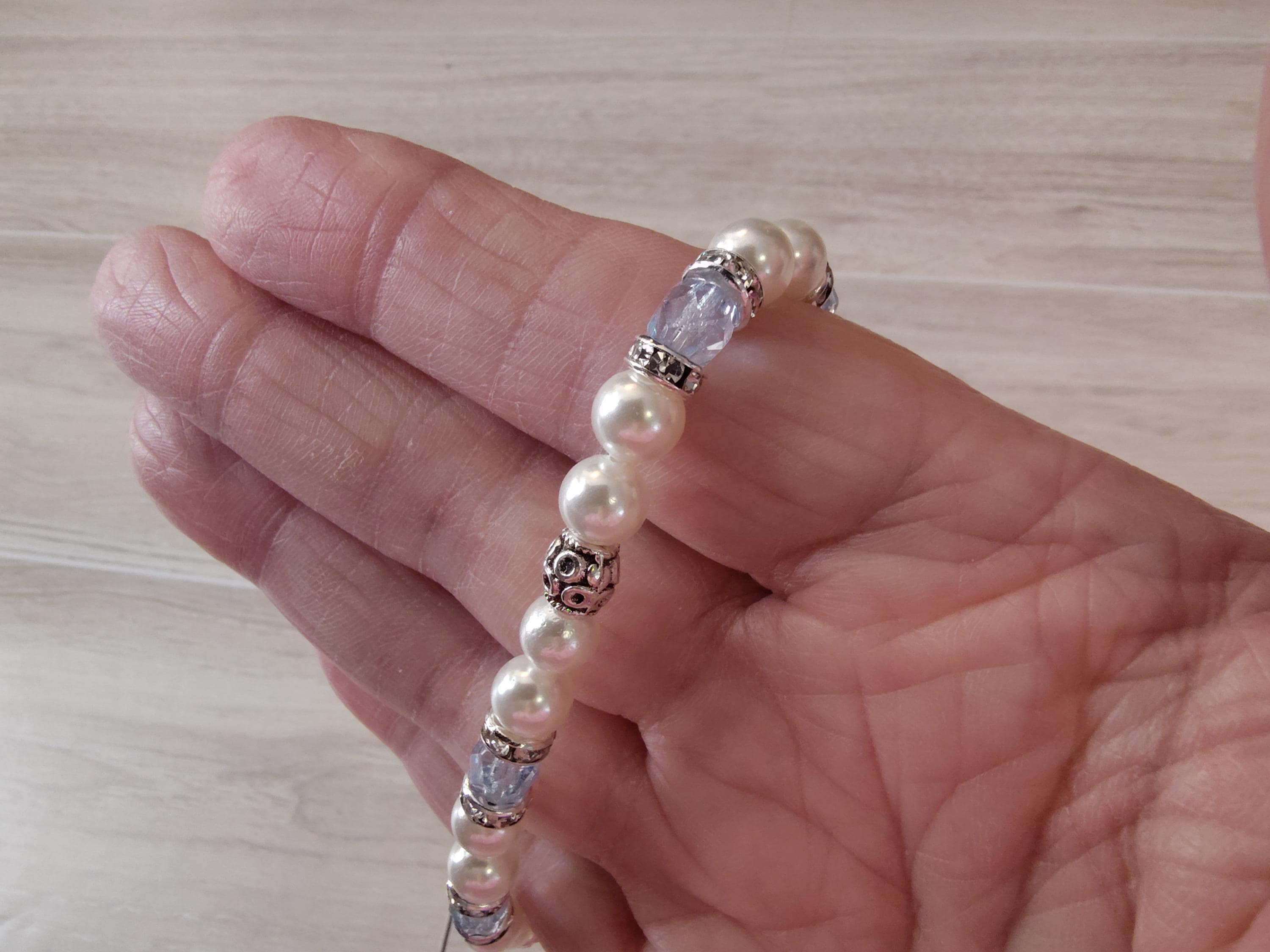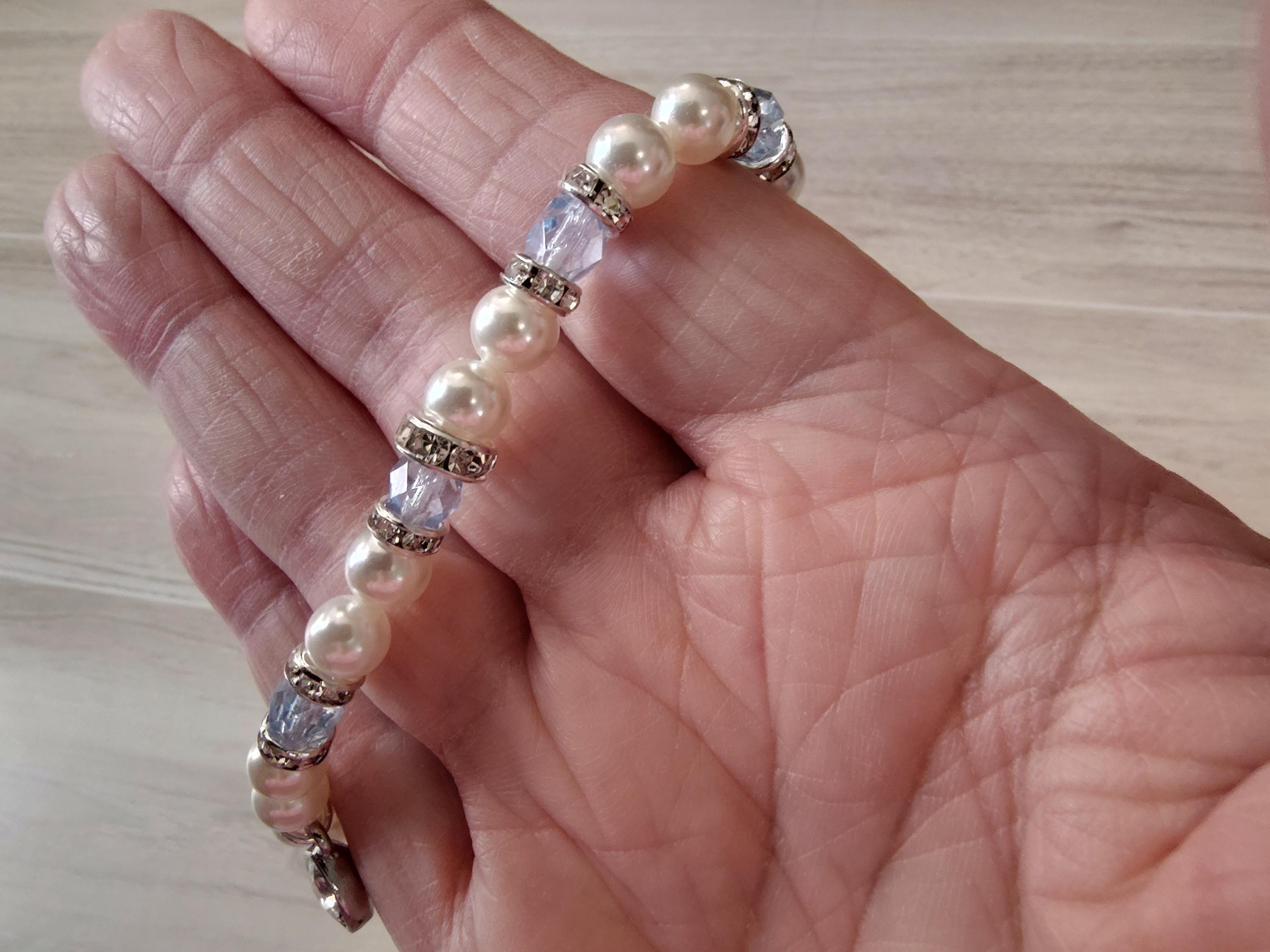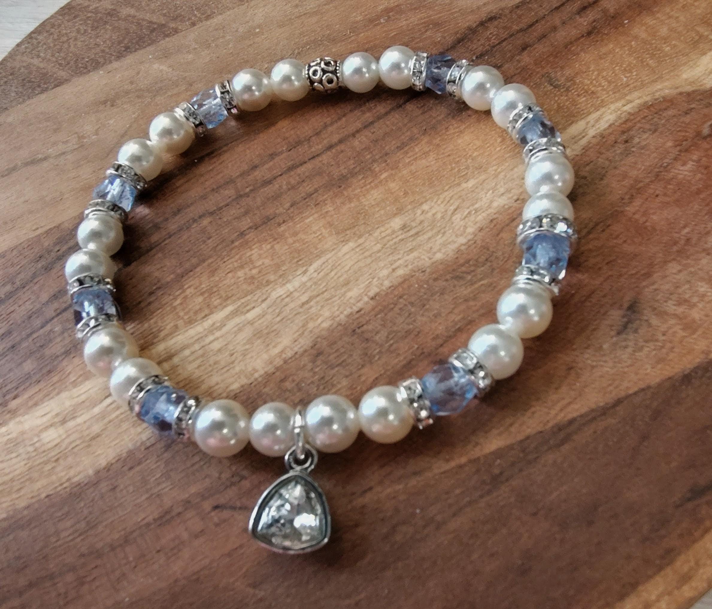 The sparkle of the light blue crystals and luninescent swarovski pearls make this a perfect bracelet for spring and summer! This kit includes: