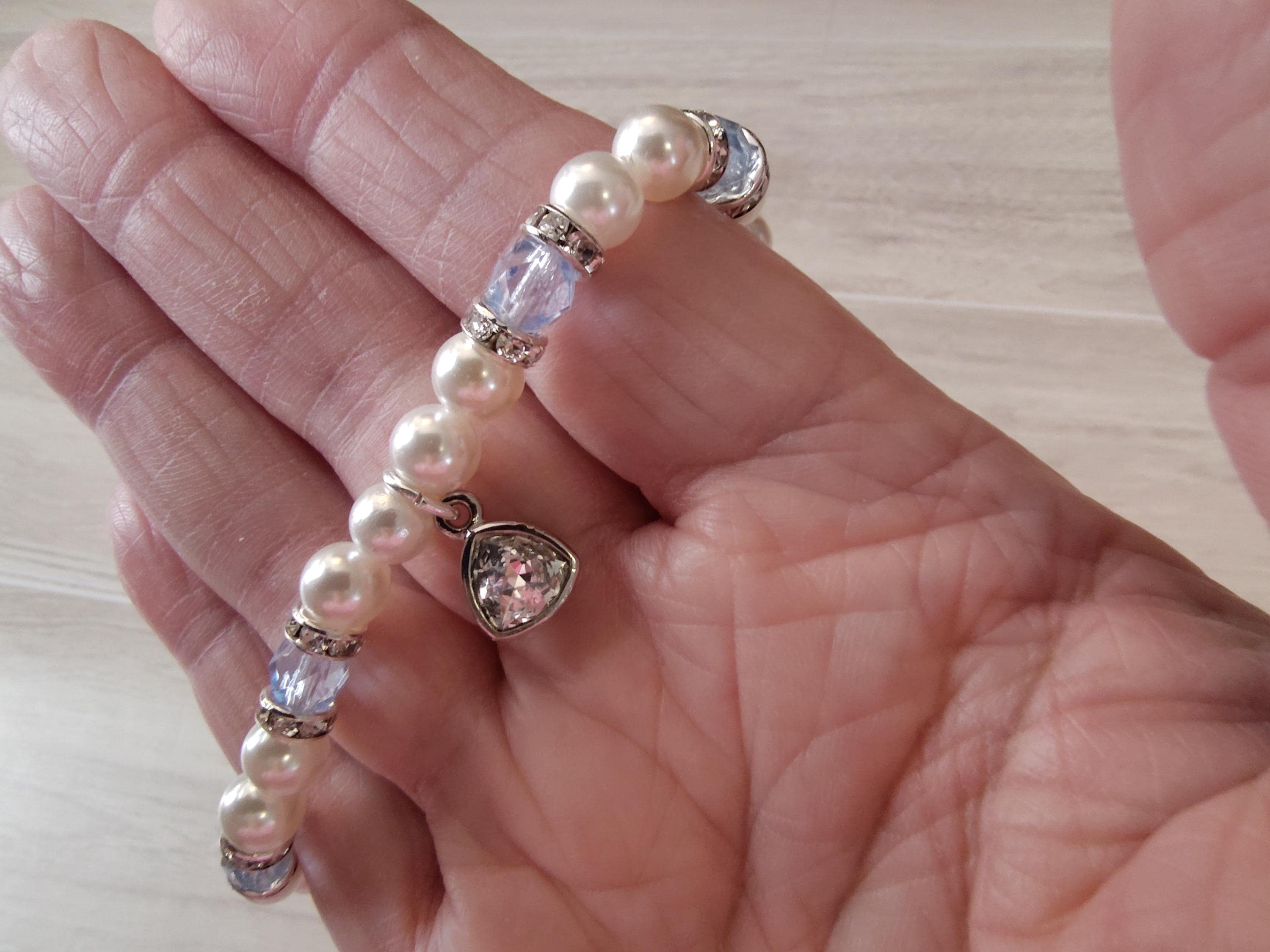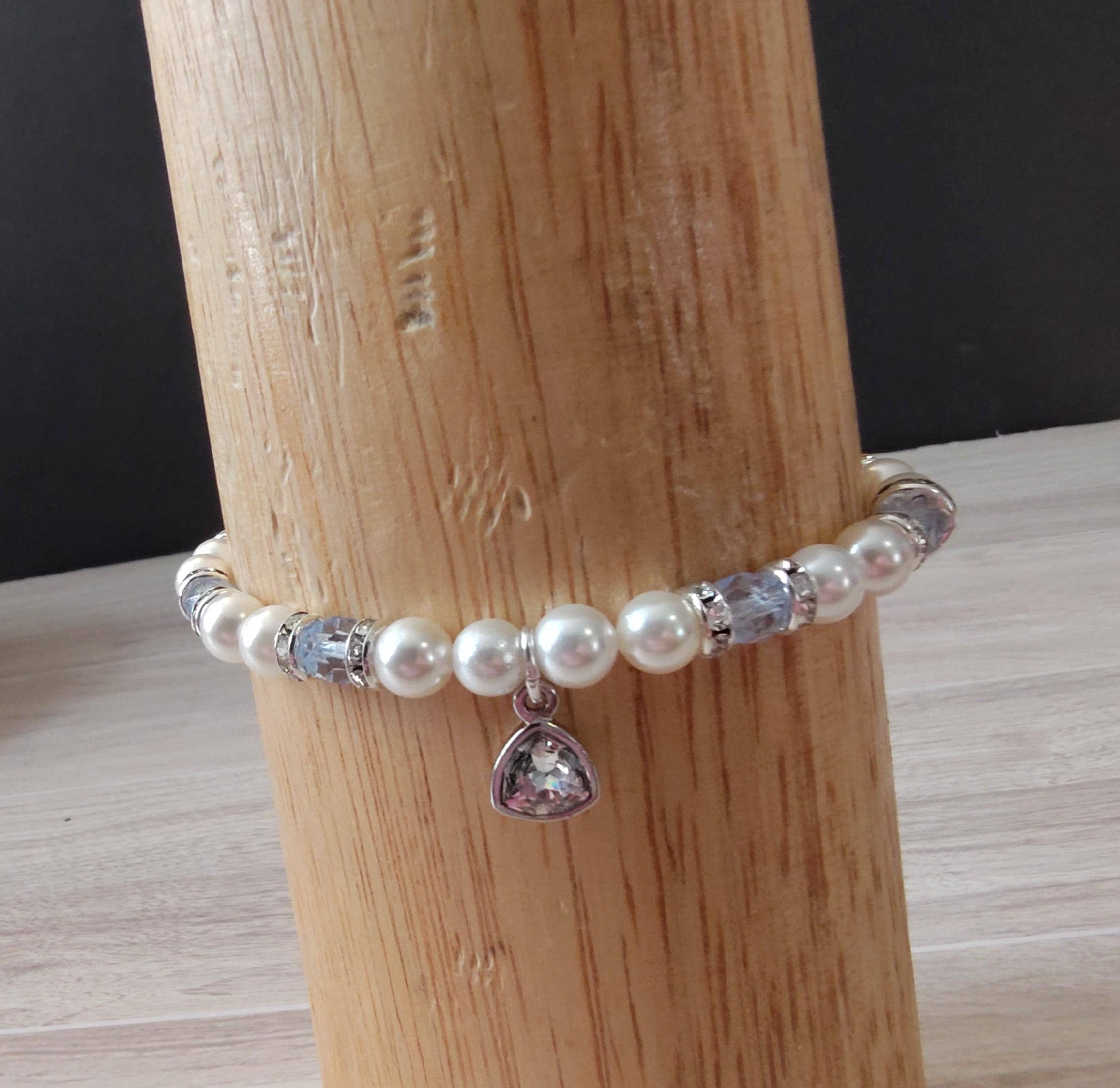 6mm white swarovski pearls, 5x7mm light blue crystal bicones and a swarovski crystal triangle dangle.