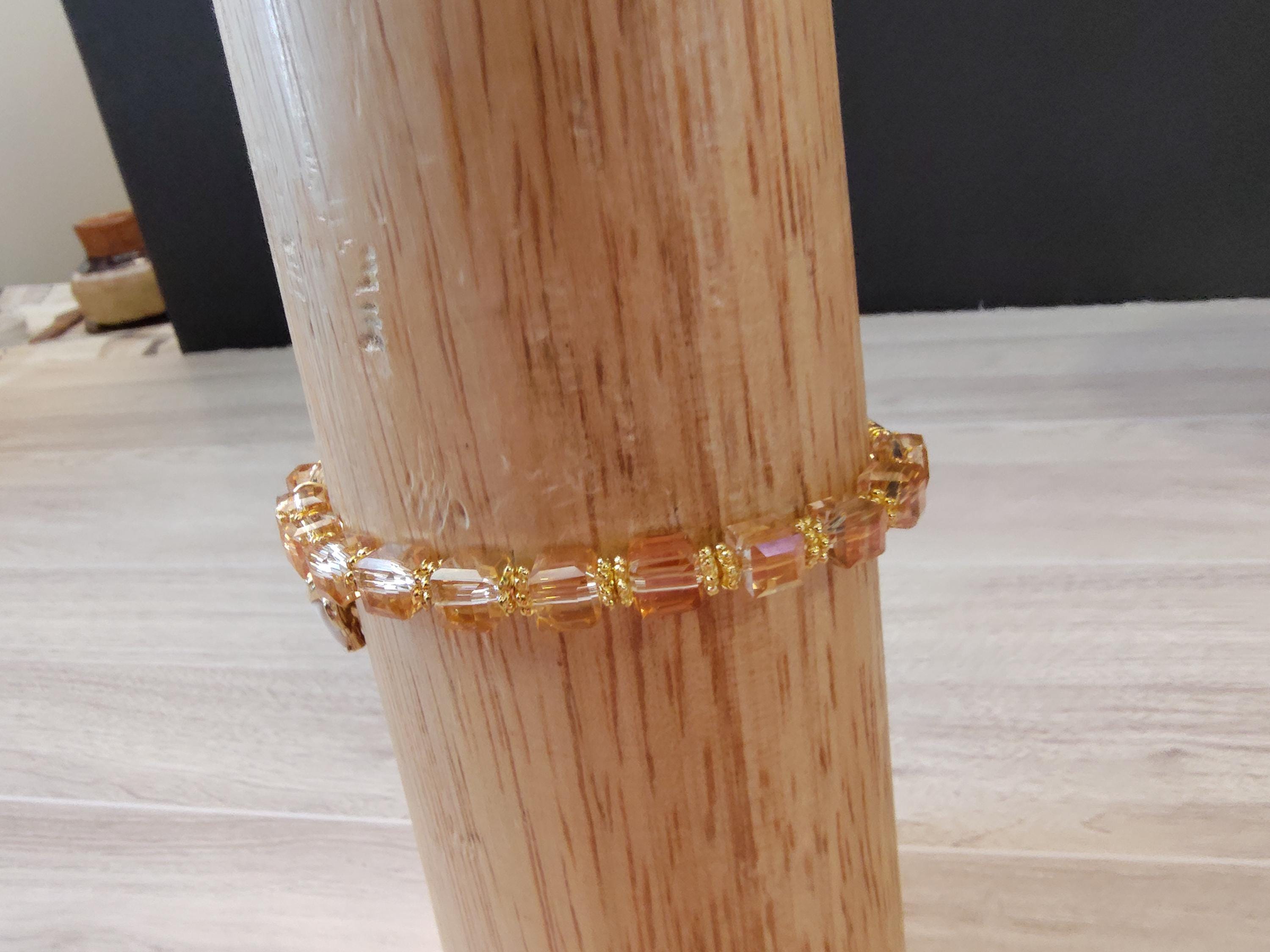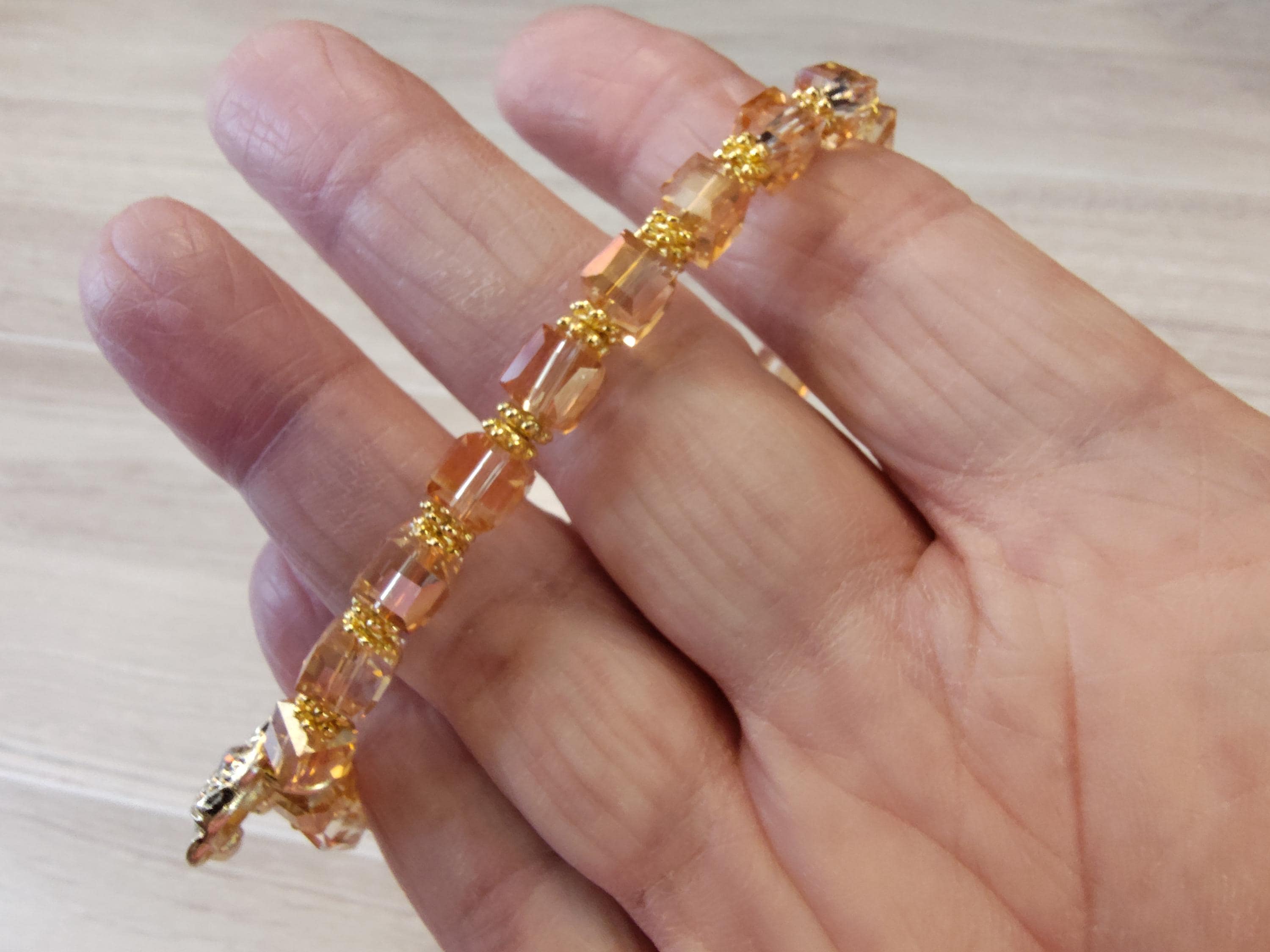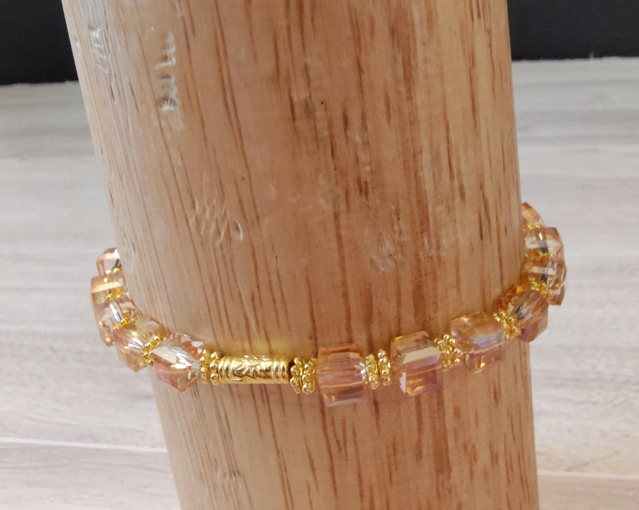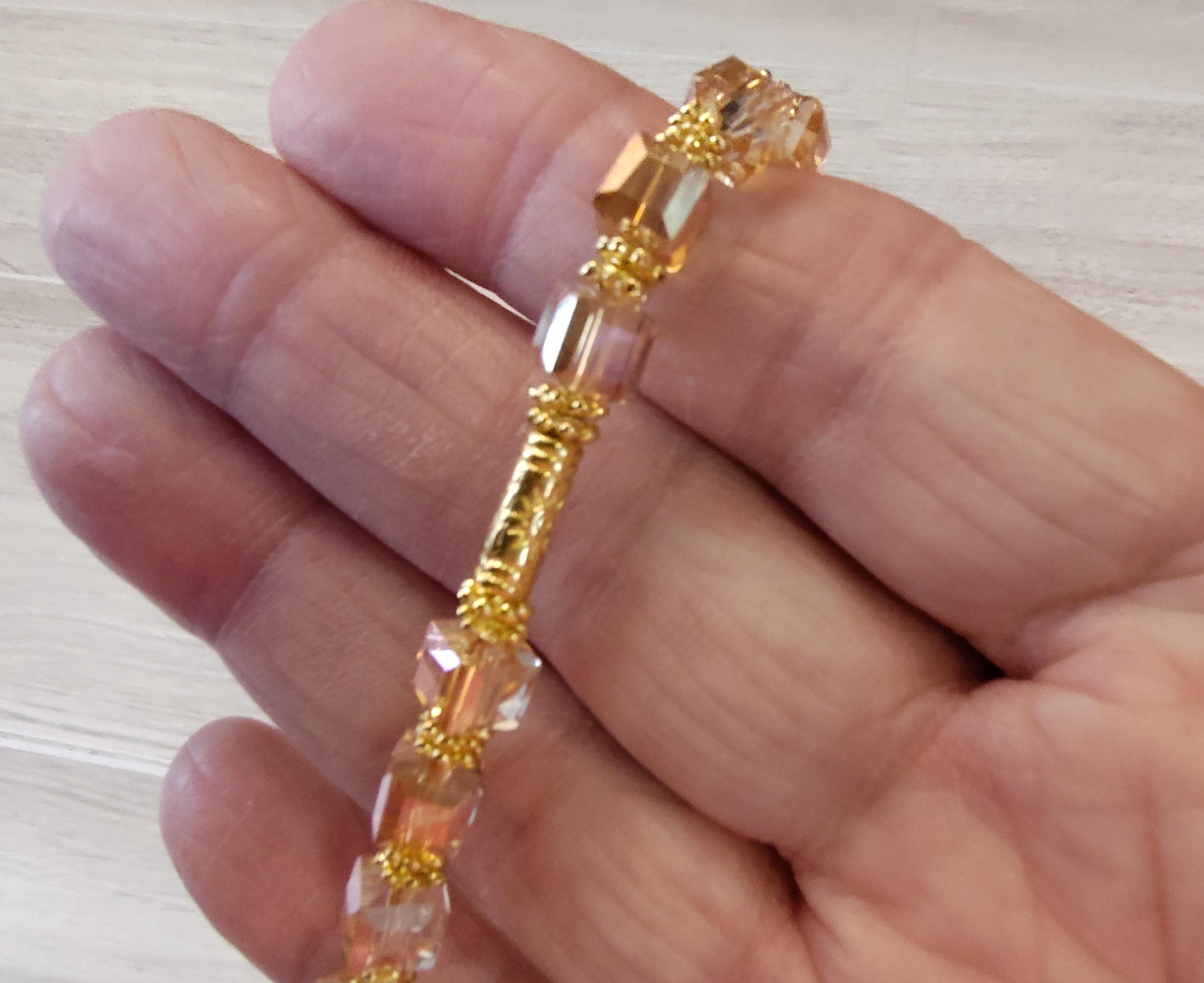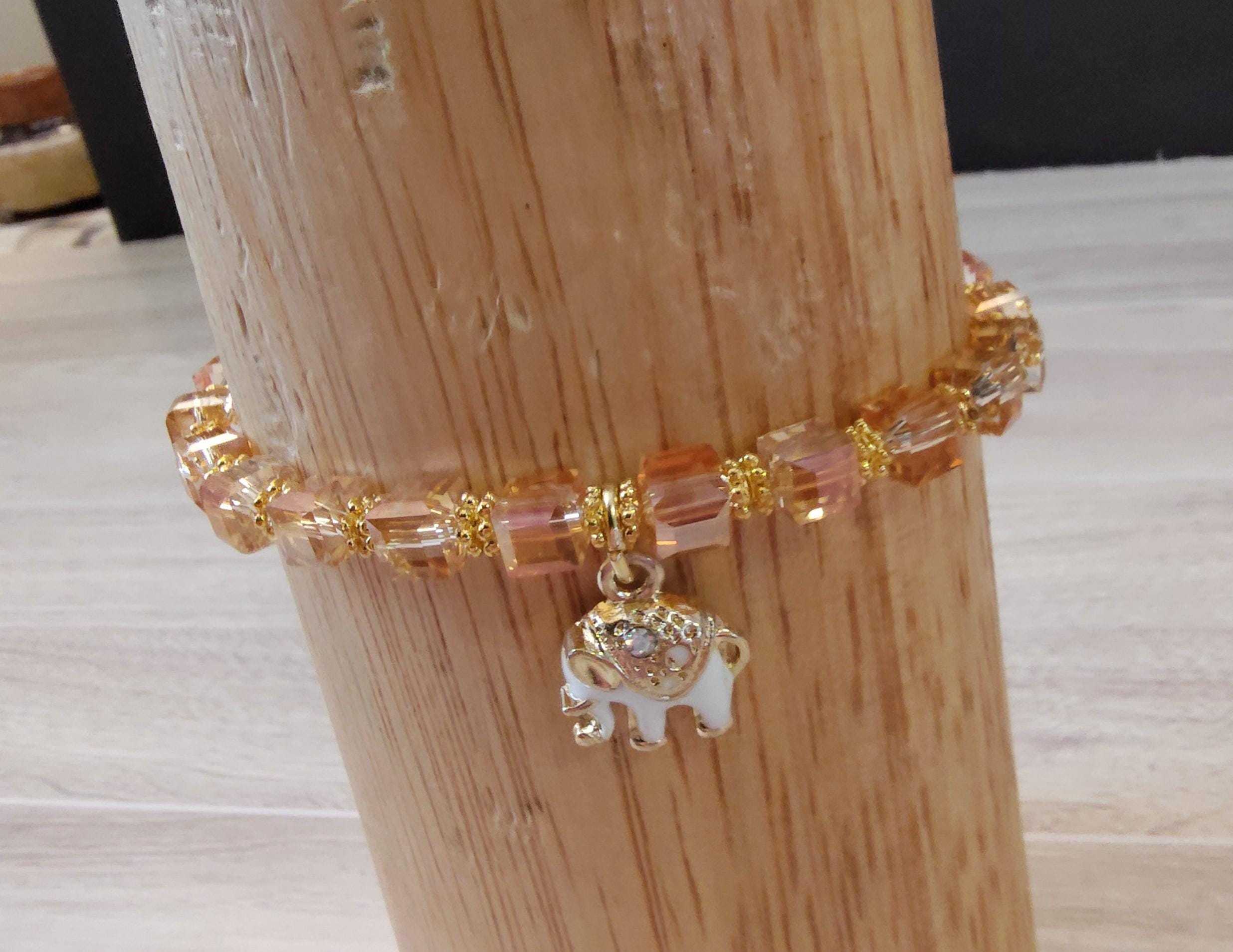 The sparkle in these crystal cubes are wonderful. The peach colored crystal cubes go so well with the gold in the elephant dangle.