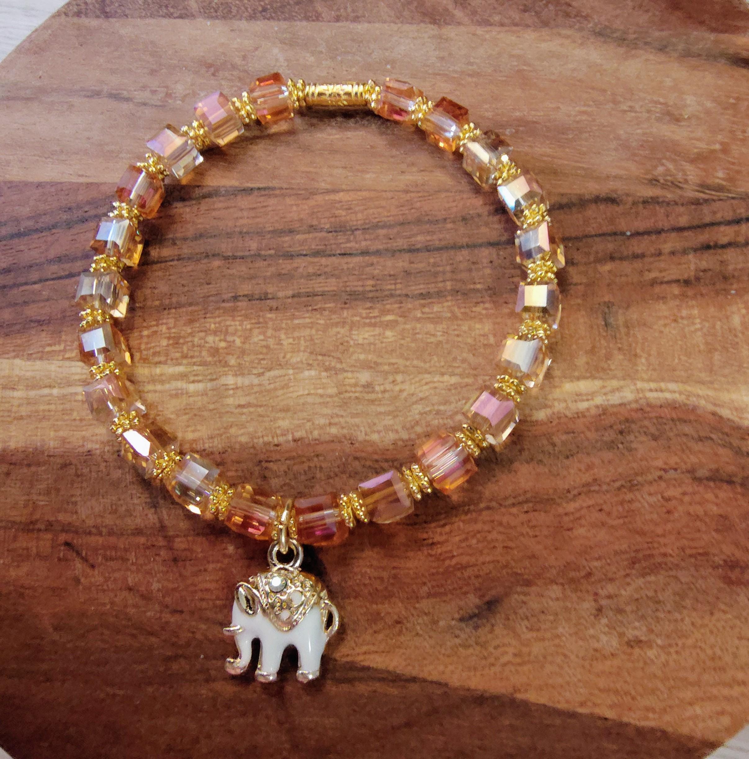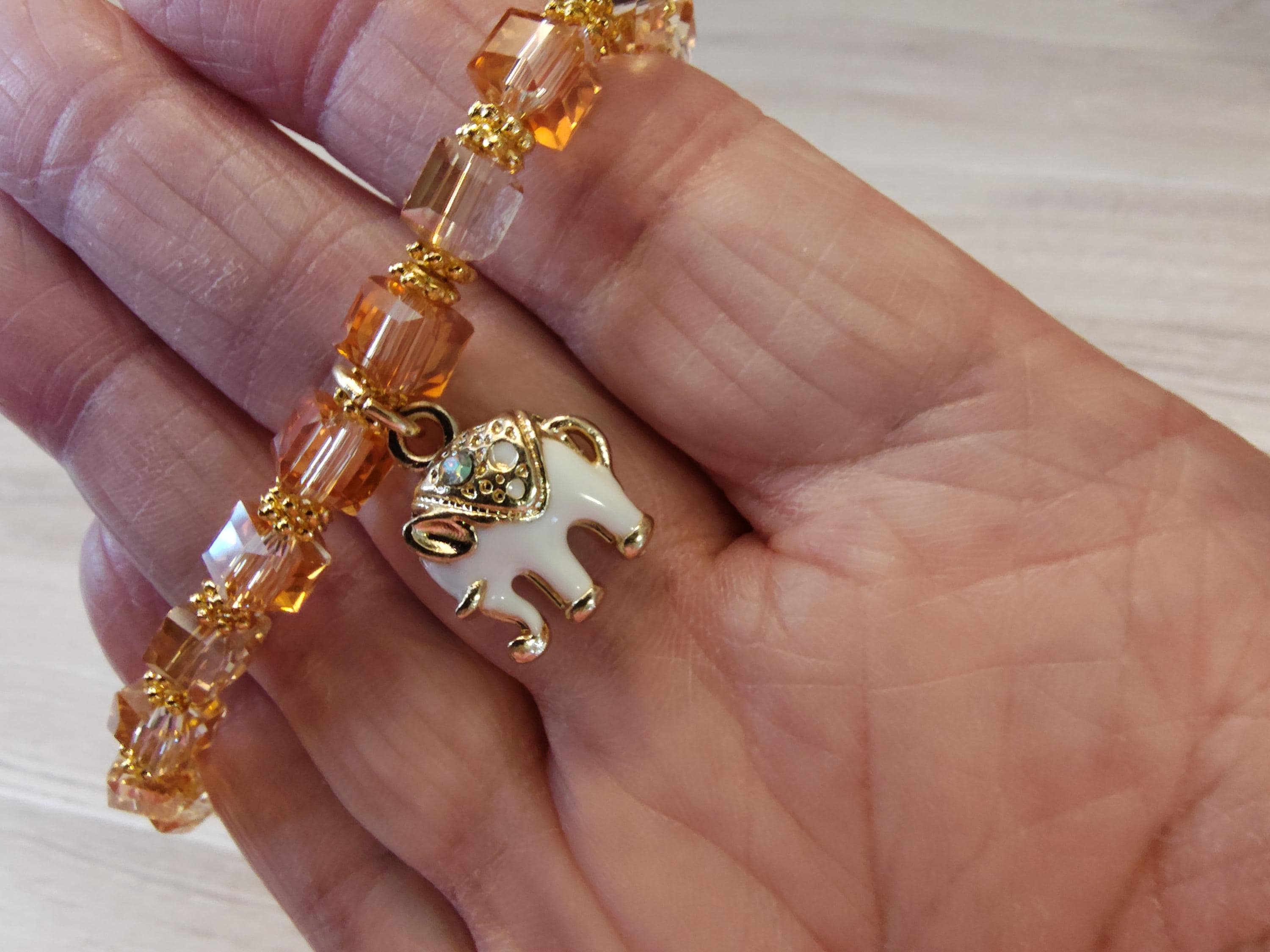 6mm faceted peach glass crystal cubes, gold spacers and a 17x14mm white and gold elephant dangle.