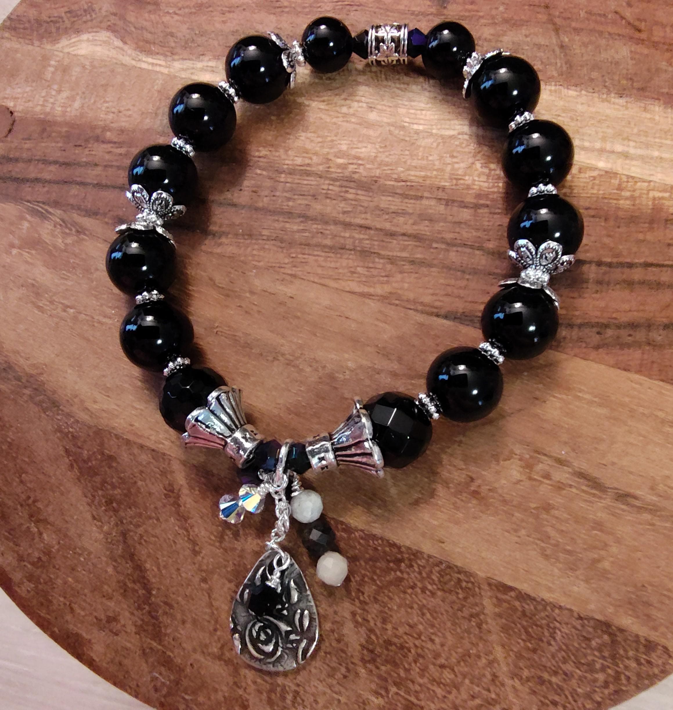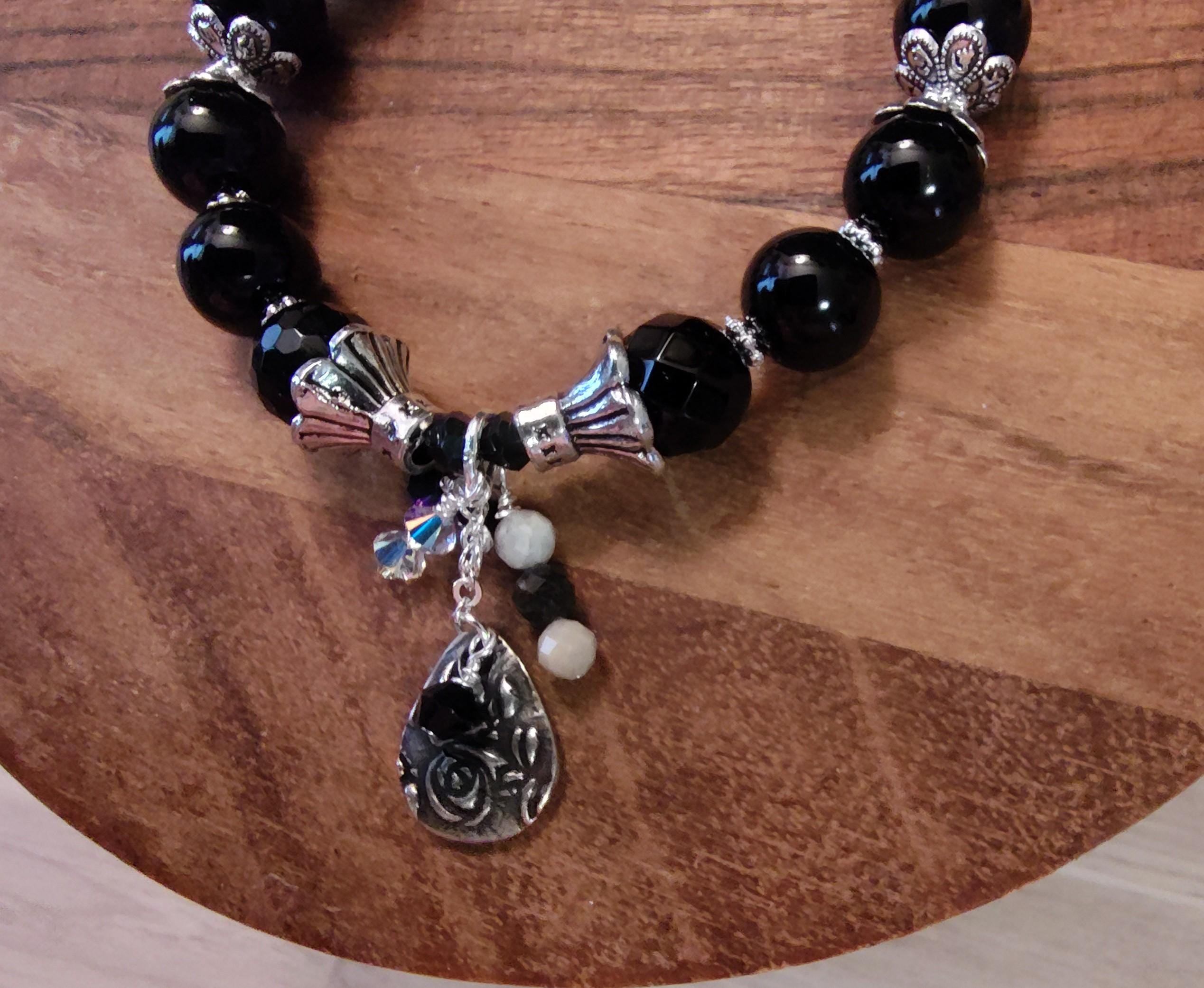 10mm faced and smooth black onyx stones, 4mm faceted jet bicones with aurora borealis finish, 4mm black and white crystals, antique silver bead caps and spacers and a dangle with a scroll design.