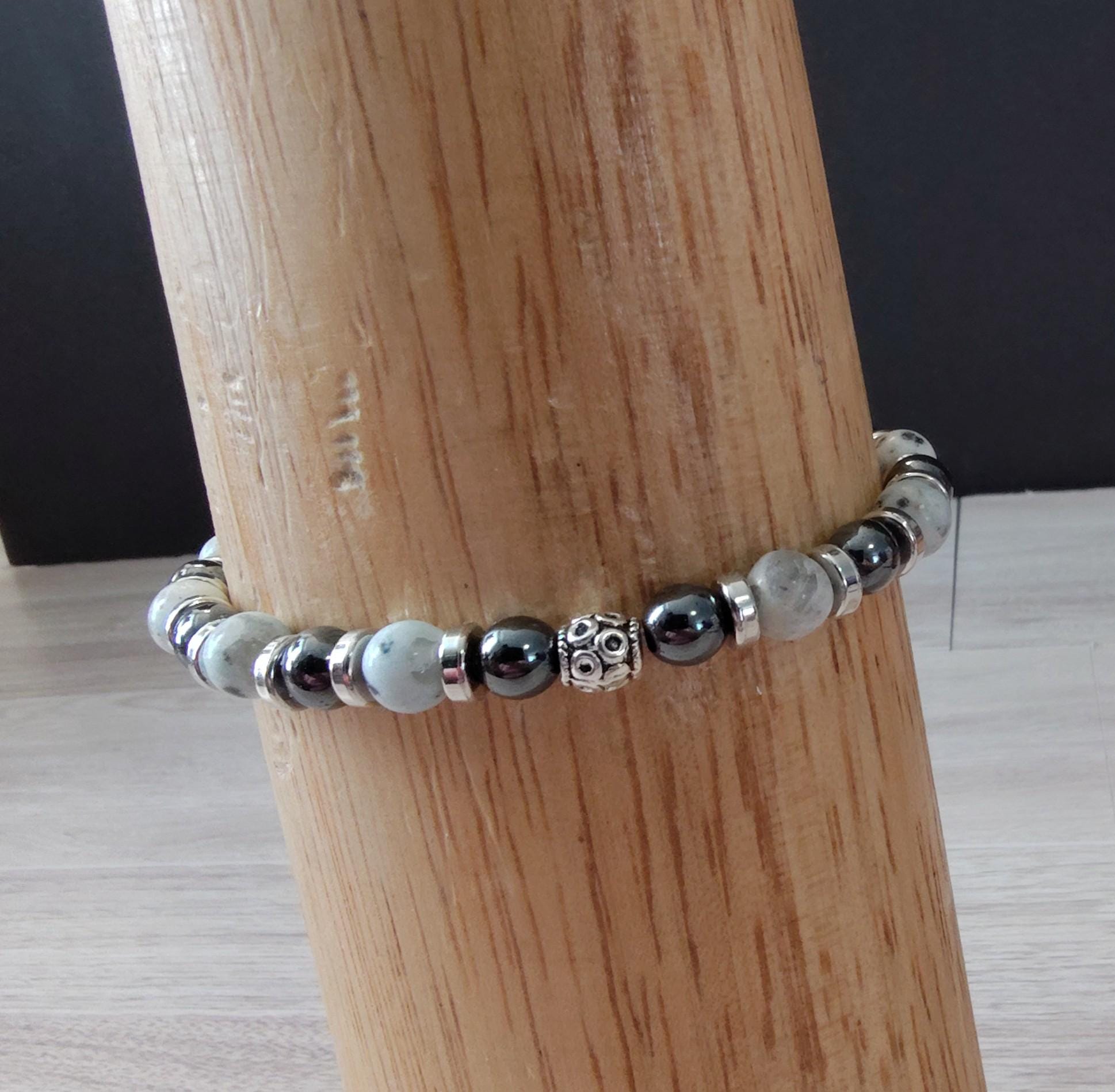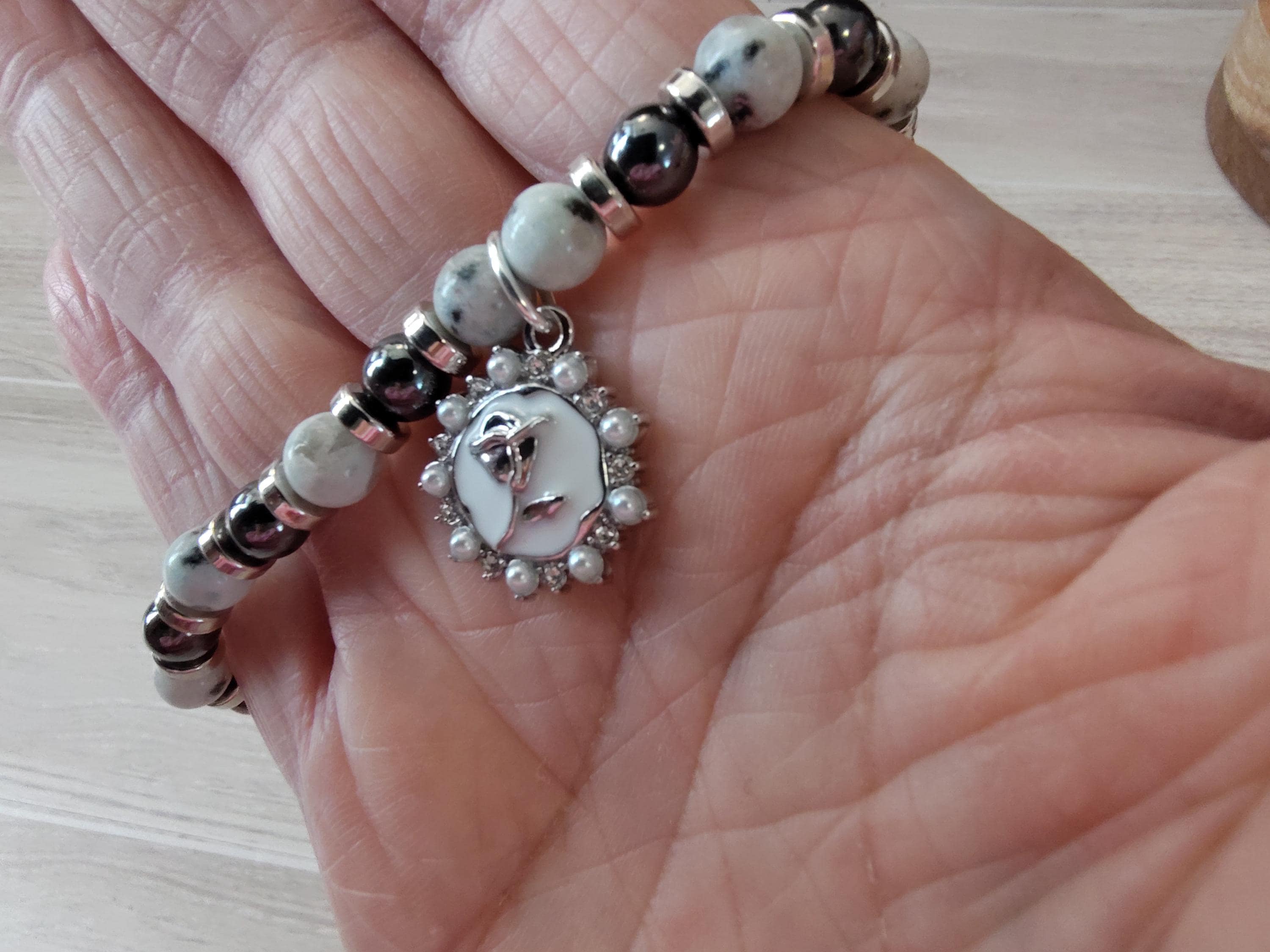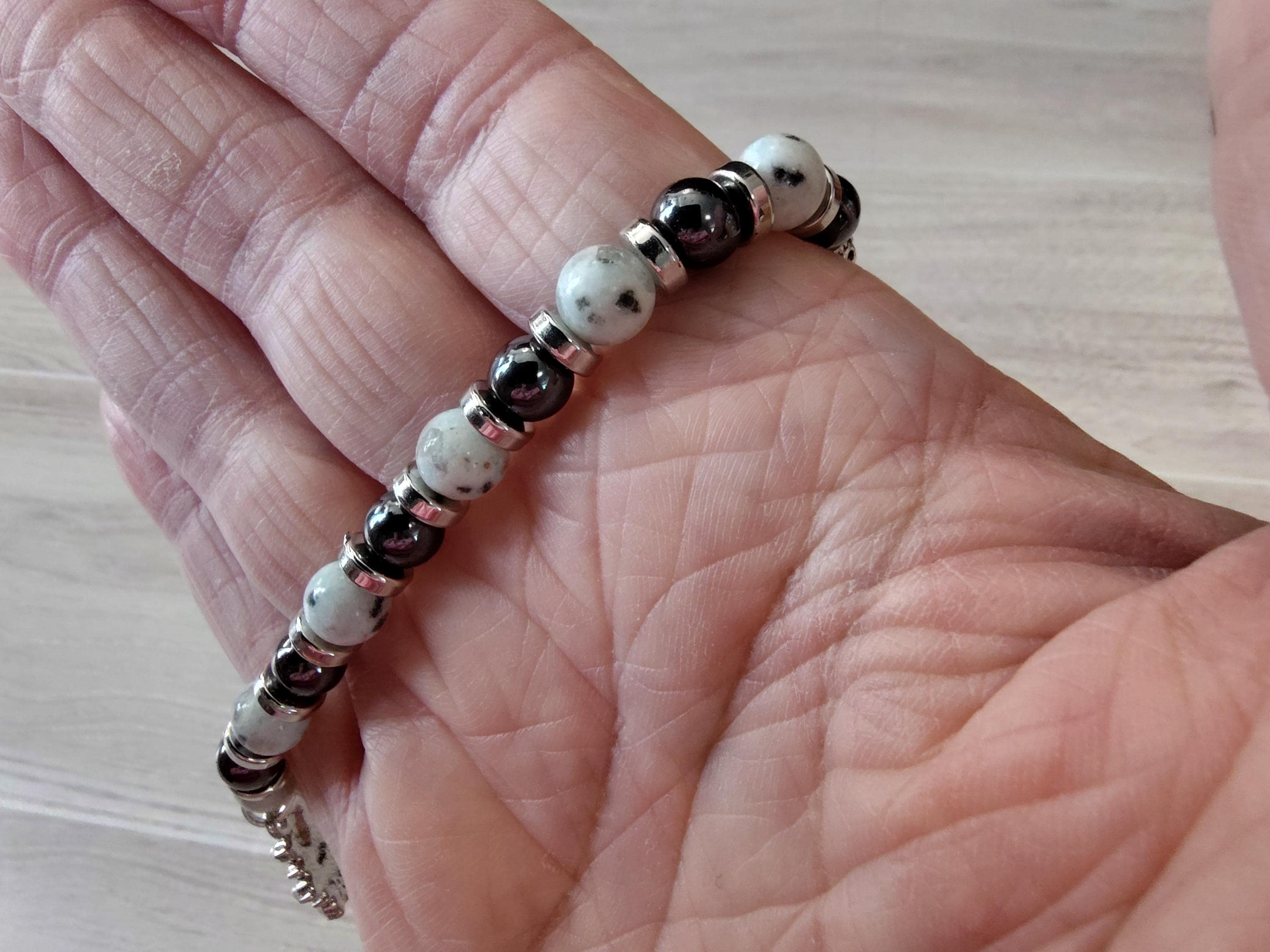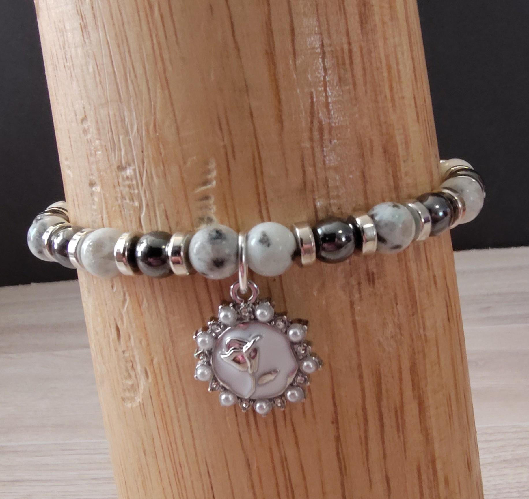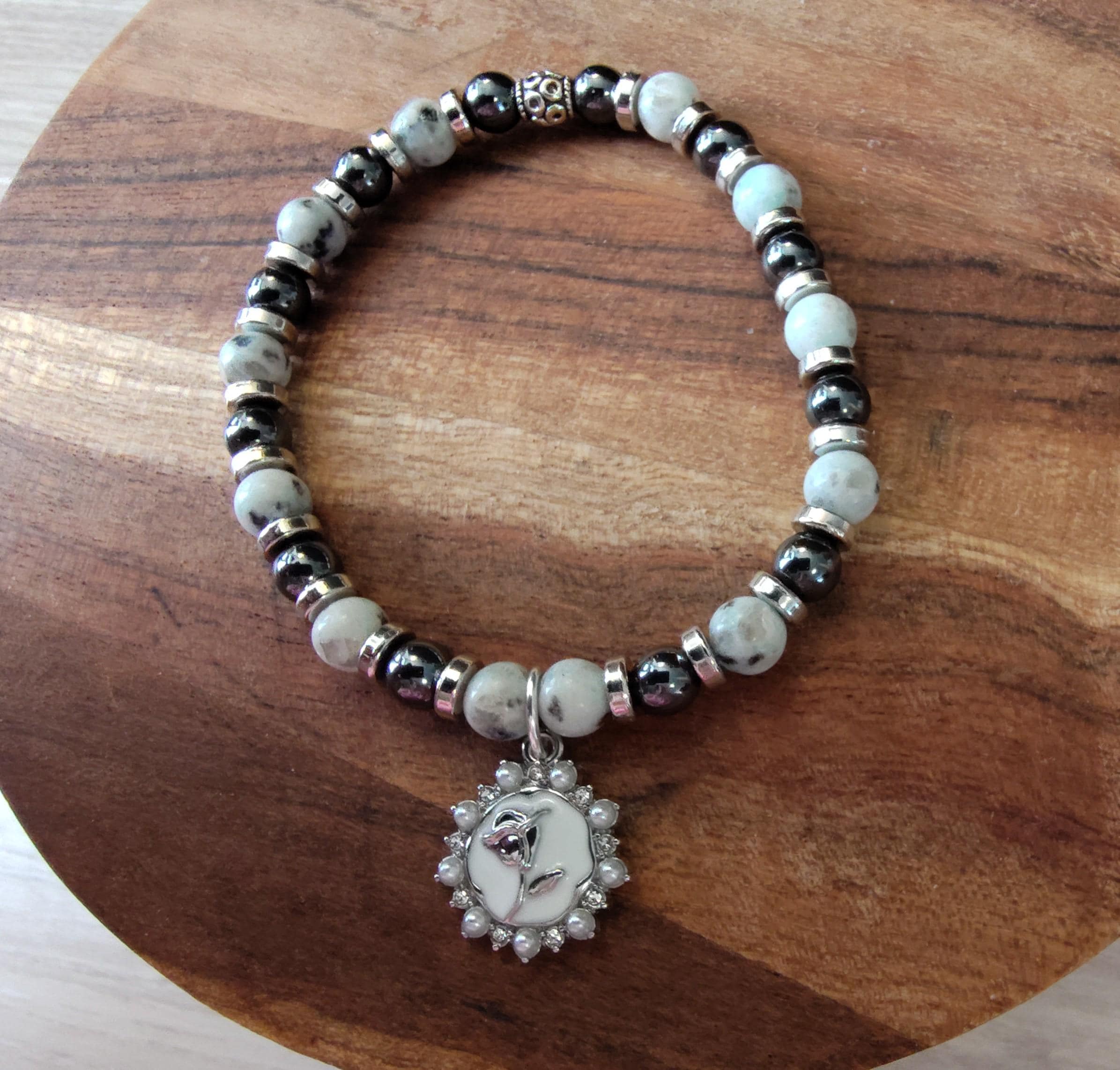 Classic white and black color scheme. Hematite and Jasper. This set includes 6mm dalmation jasper, 6mm hematite and a beautiful 20x18mm enameled faux flower pearl.