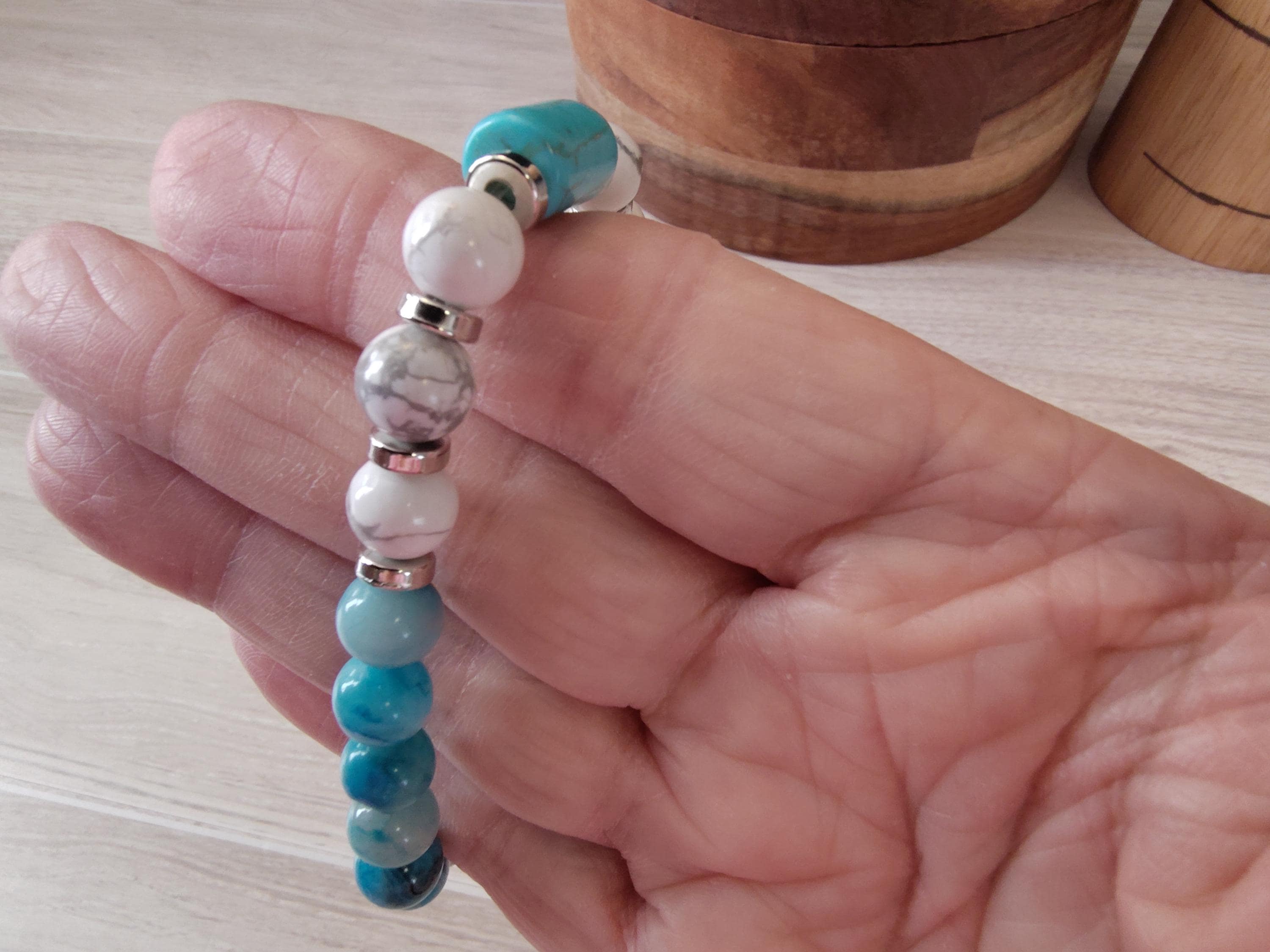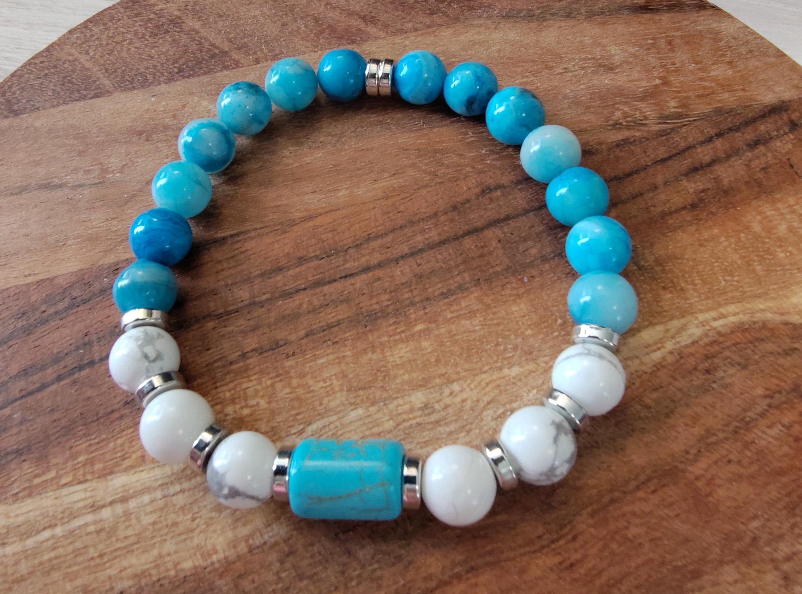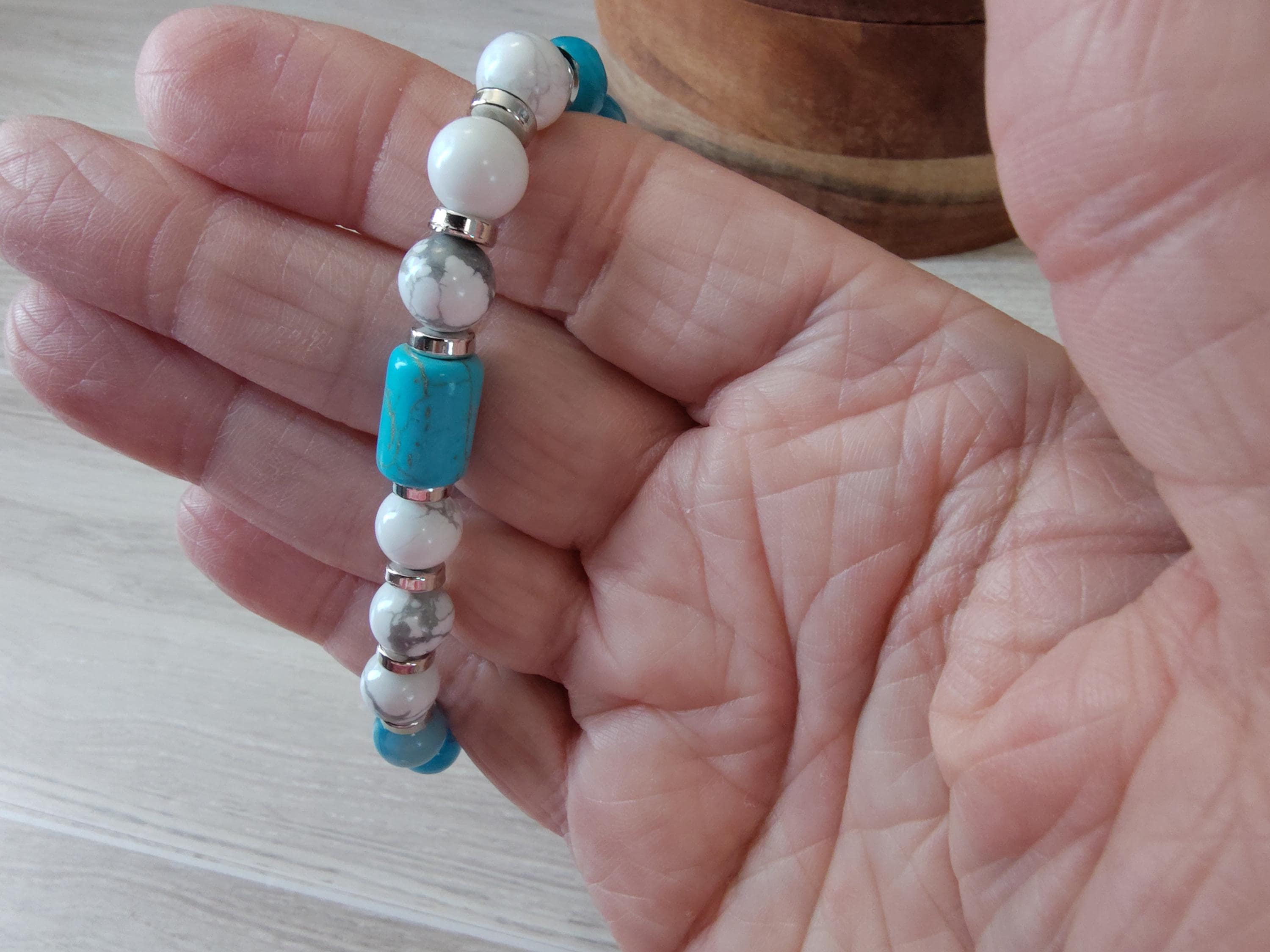 Beautiful blue and white gemstone bracelet. Perfect for spring and summer. It includes an 8x12mm howlite (turquoise dyed) gemstone, 8mm howlite (white, veined) stones and blue crazy lace agates.