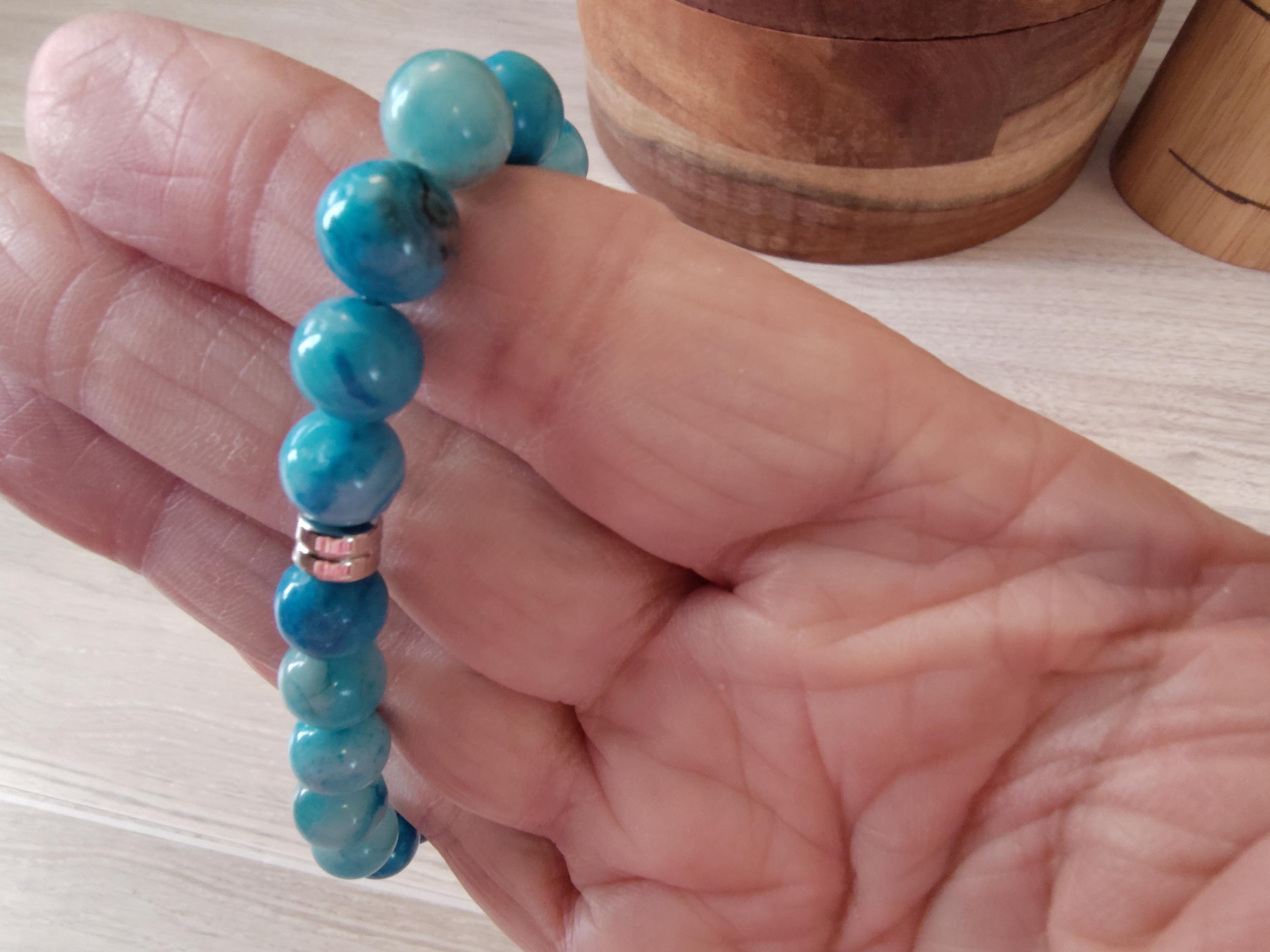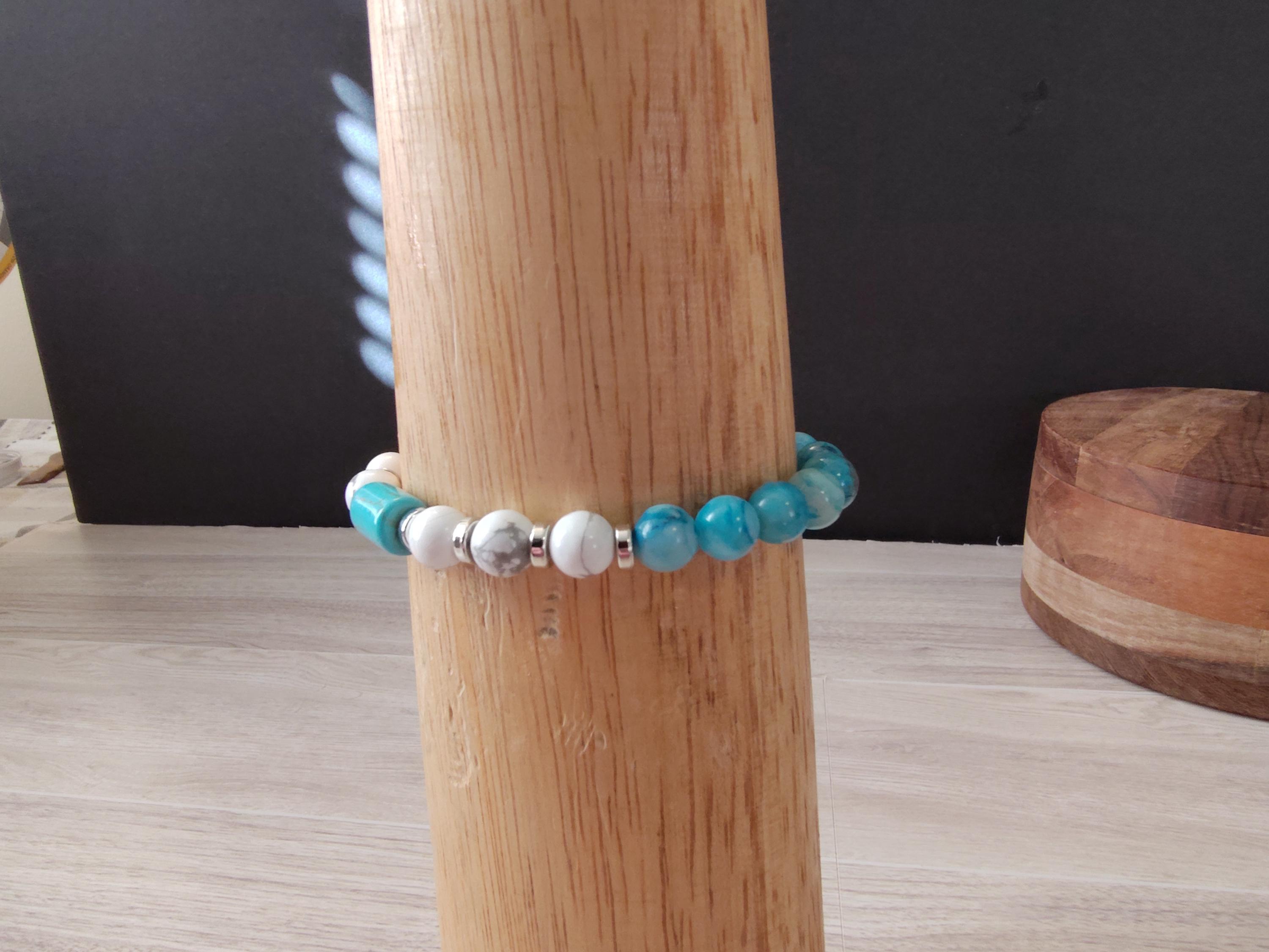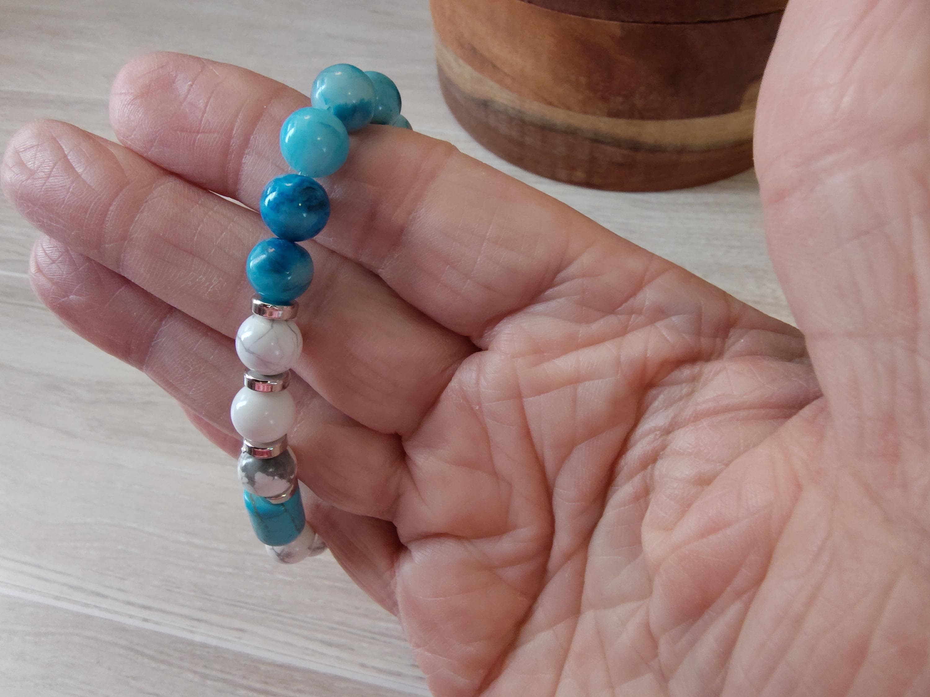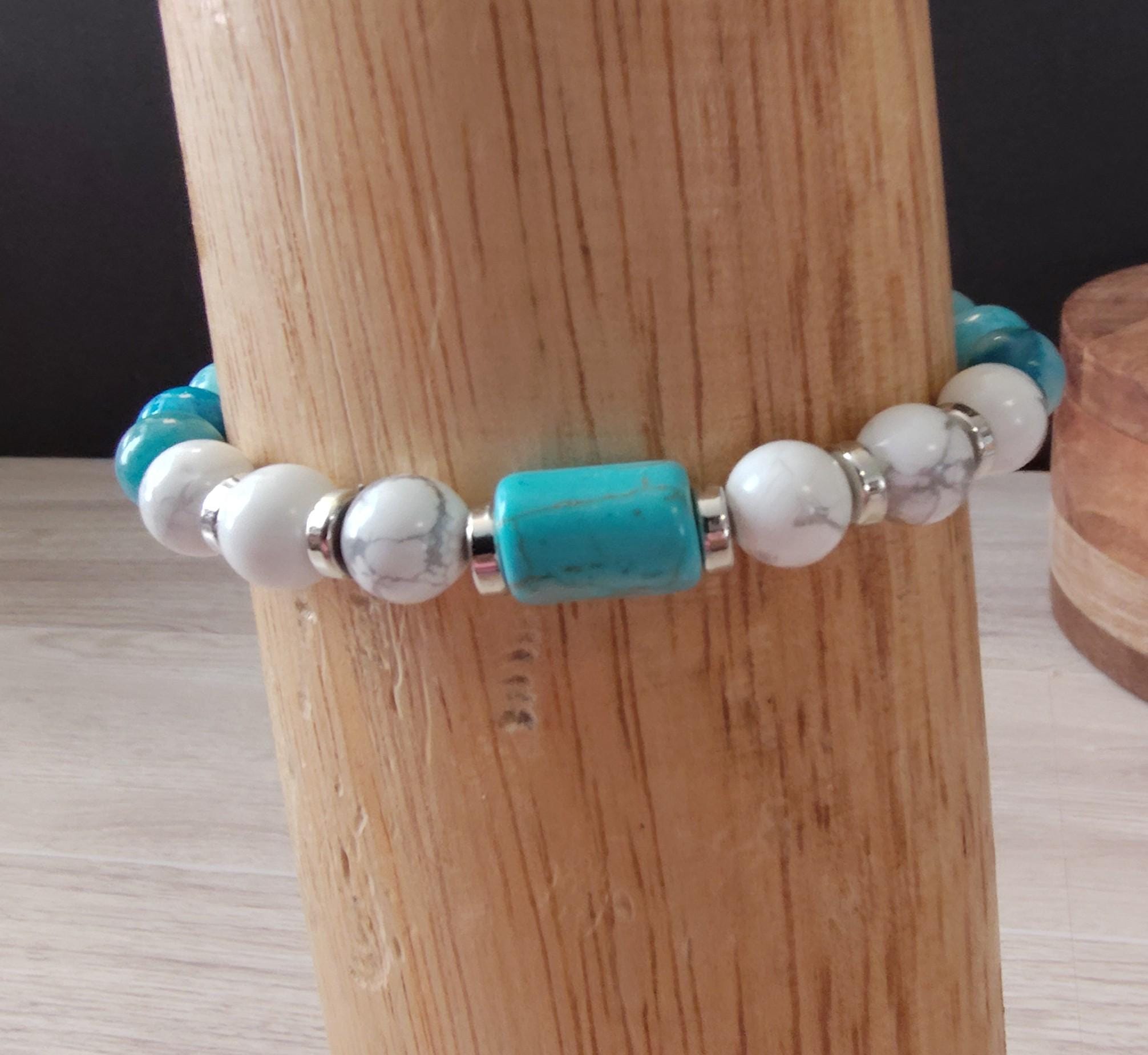 Beautiful blue and white gemstone bracelet. Perfect for spring and summer. It includes an 8x12mm howlite (turquoise dyed) gemstone, 8mm howlite (white, veined) stones and blue crazy lace agates.