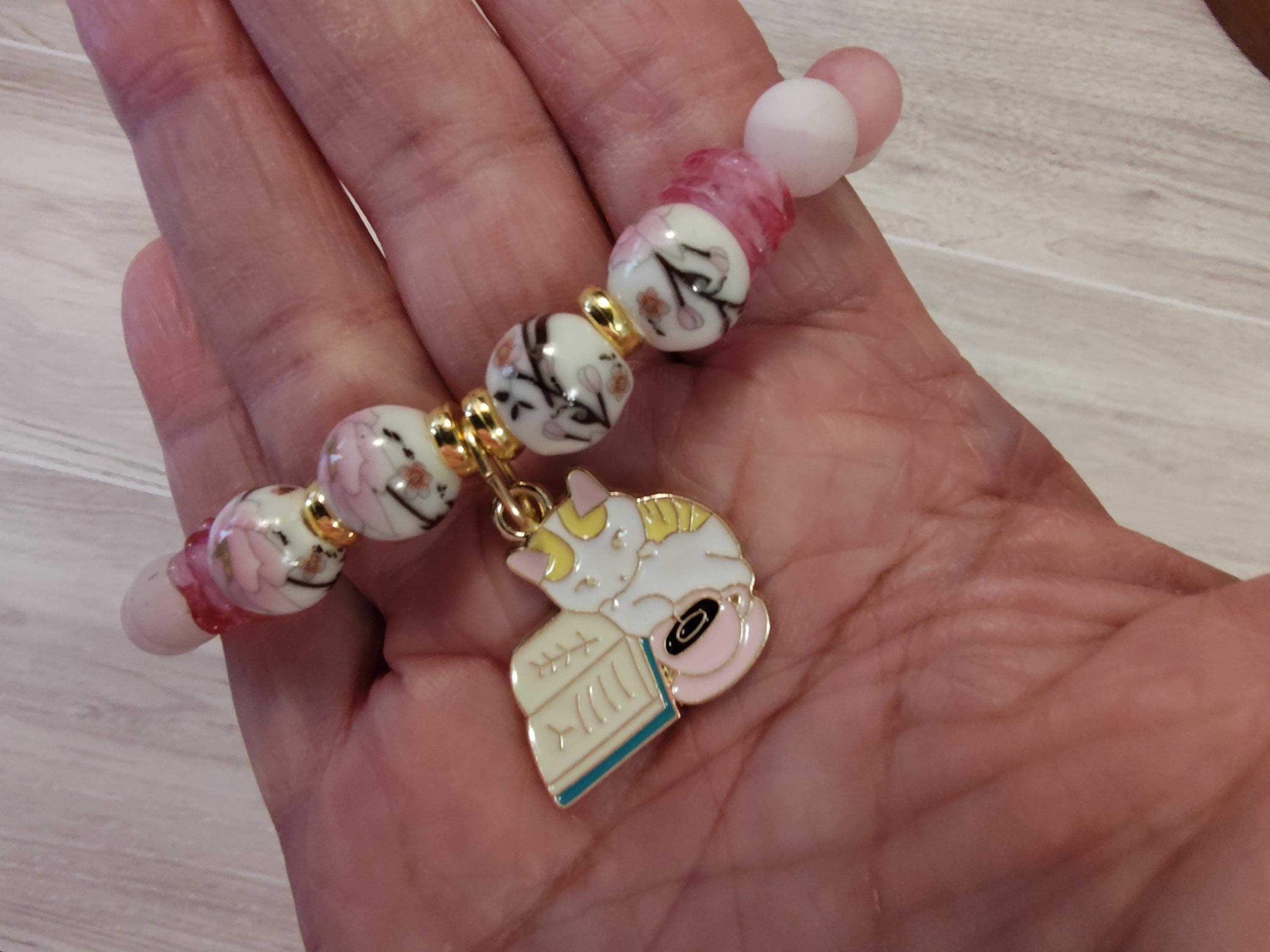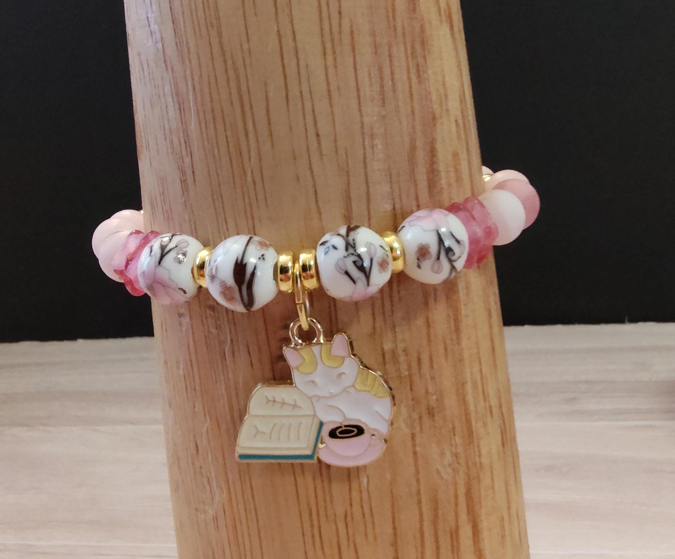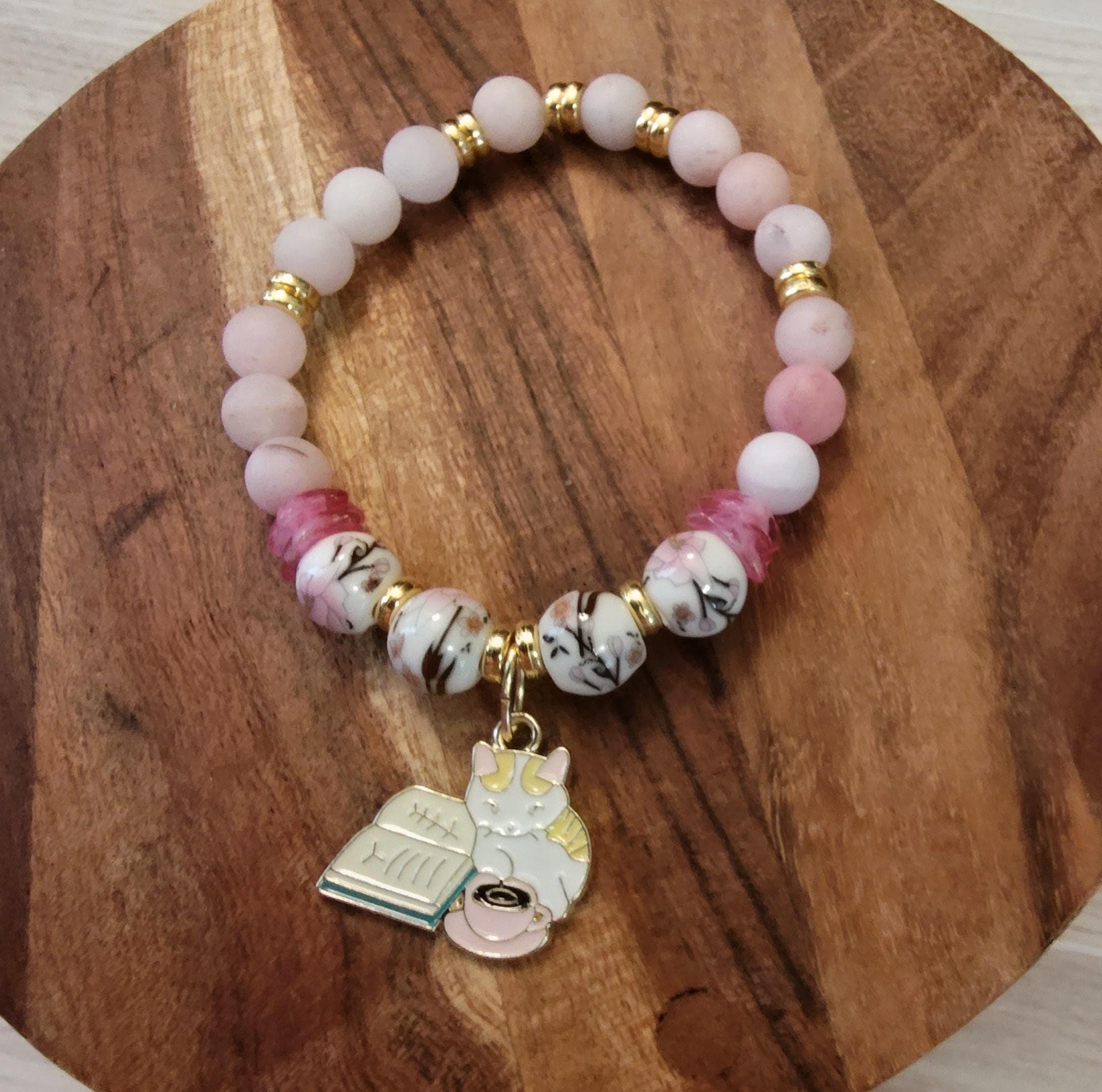 This kit includes 10mm hand-painted porcelain cherry blossom beads, 8mm frosted cherry quartz beads, and an enameled dangle featuring a cat with a cup and book.