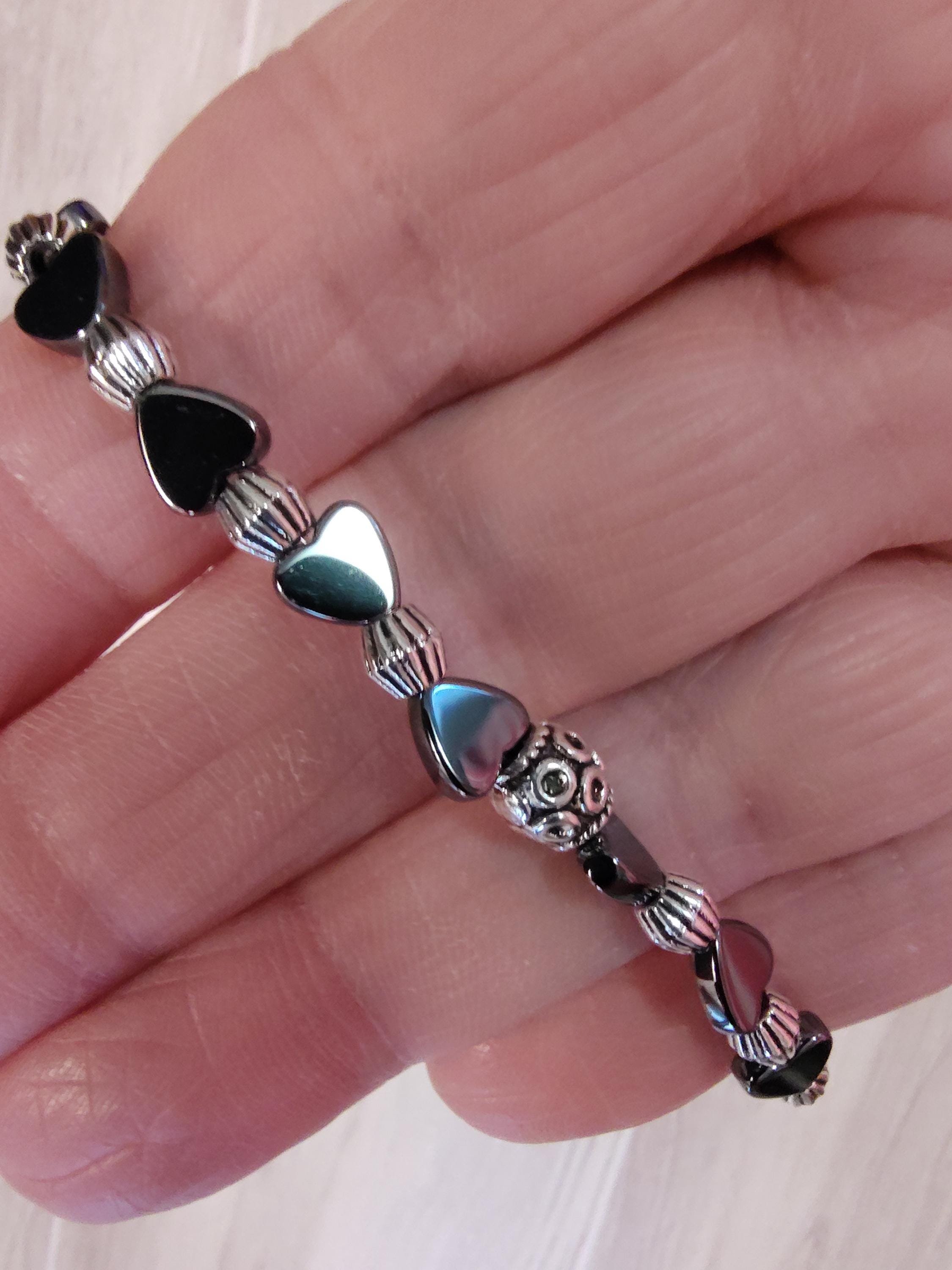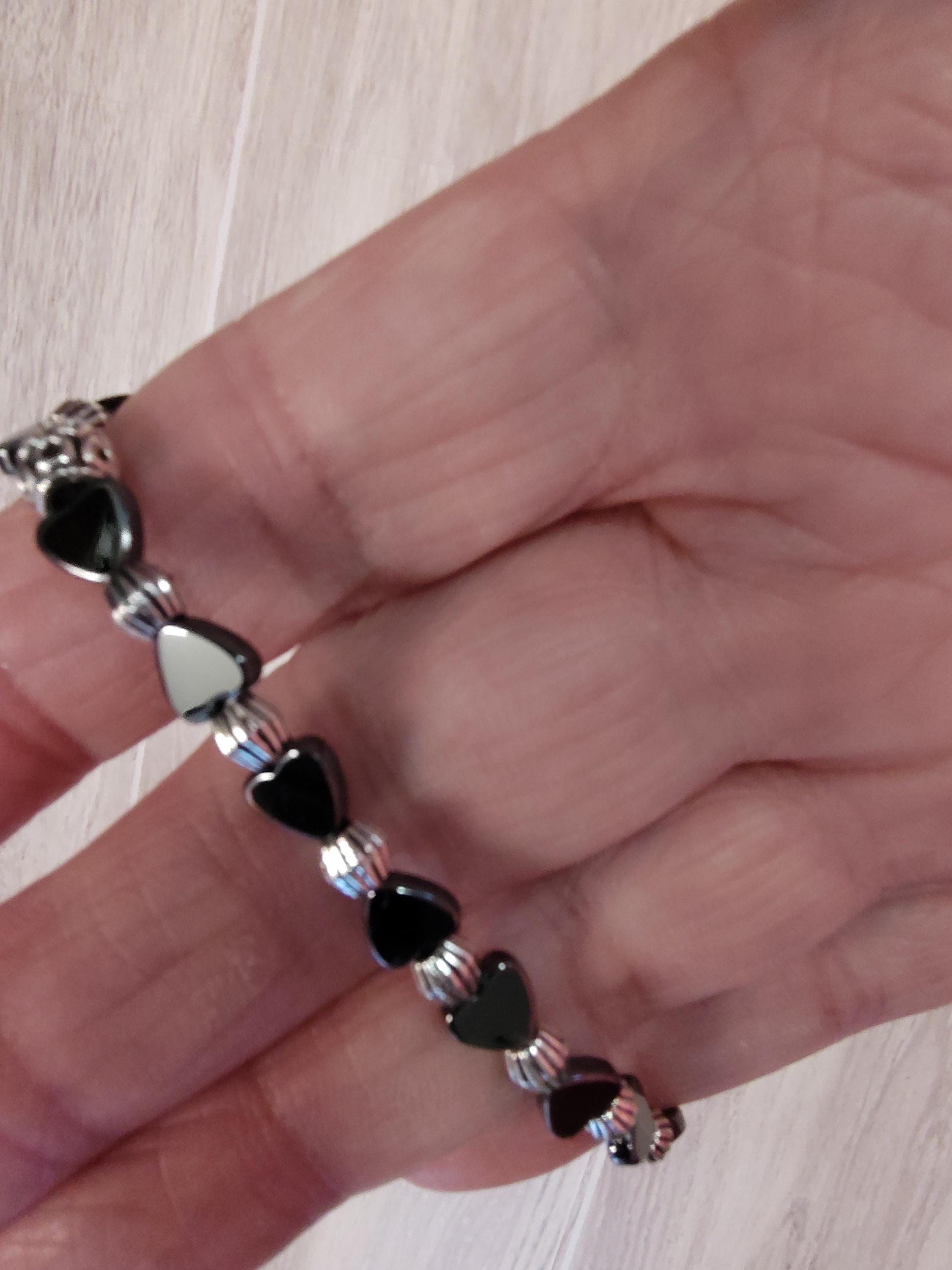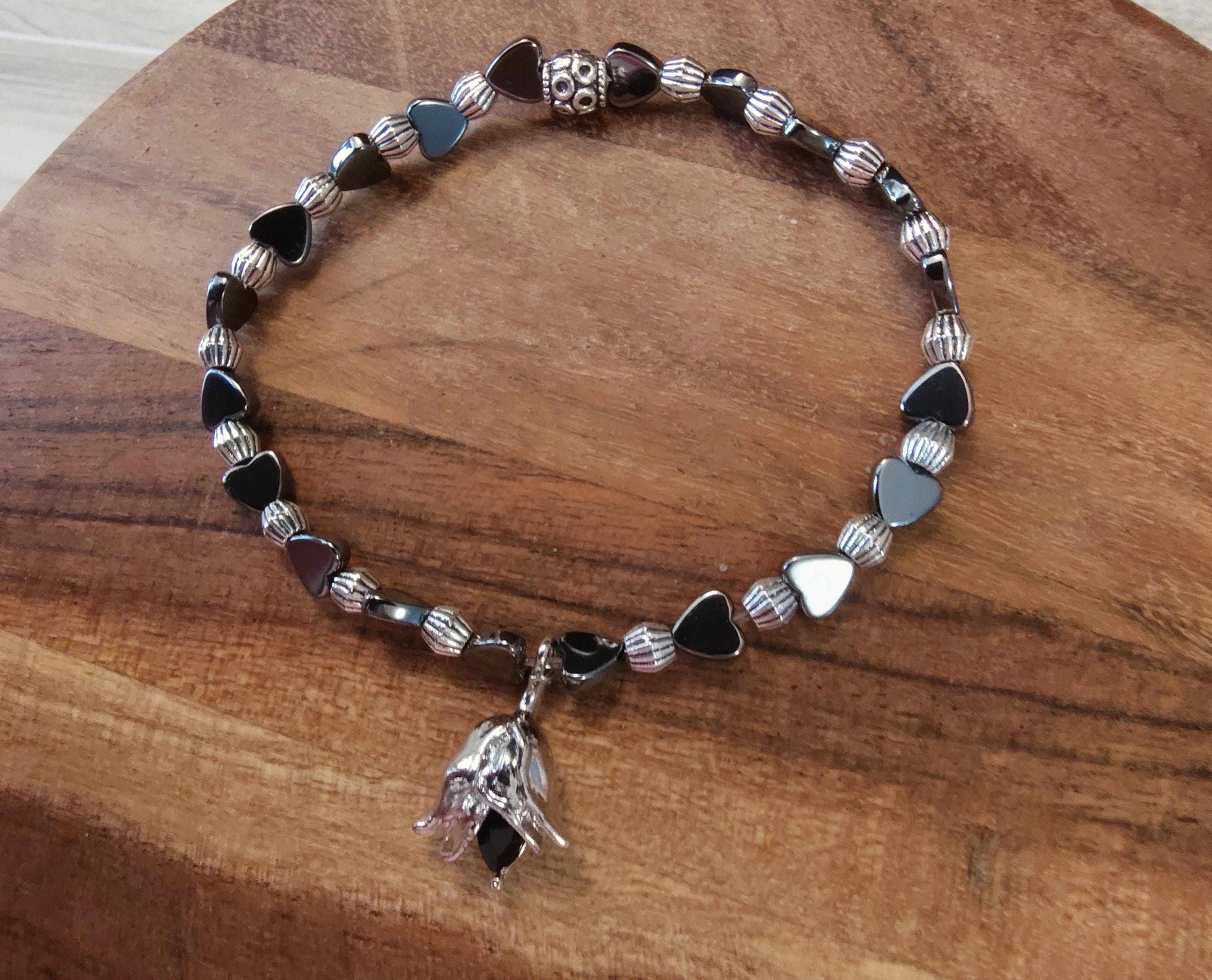 This dainty bracelet includes 5x5mm hematite hearts and a an elegant 20.5 x13mm black rose and silver dangle.