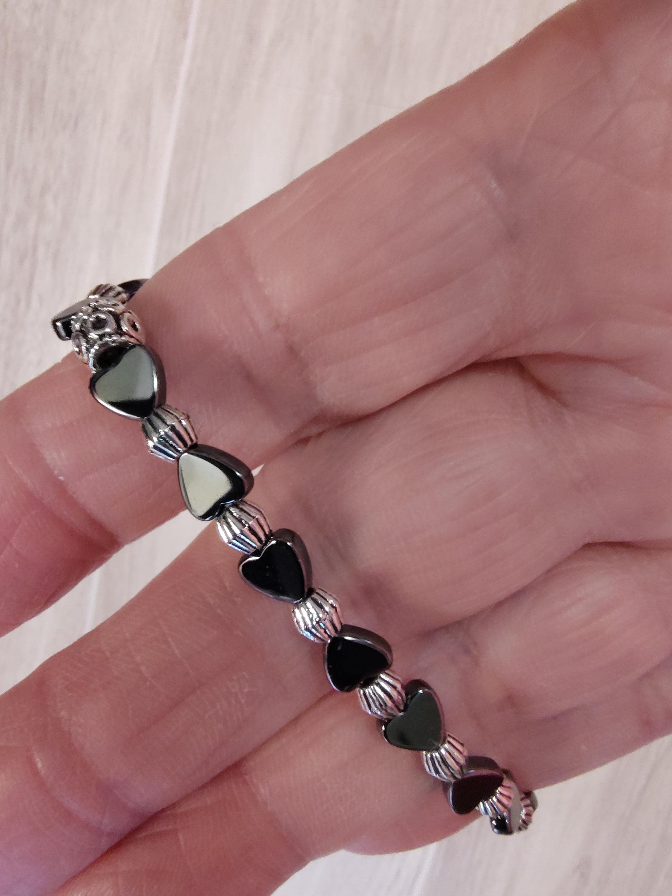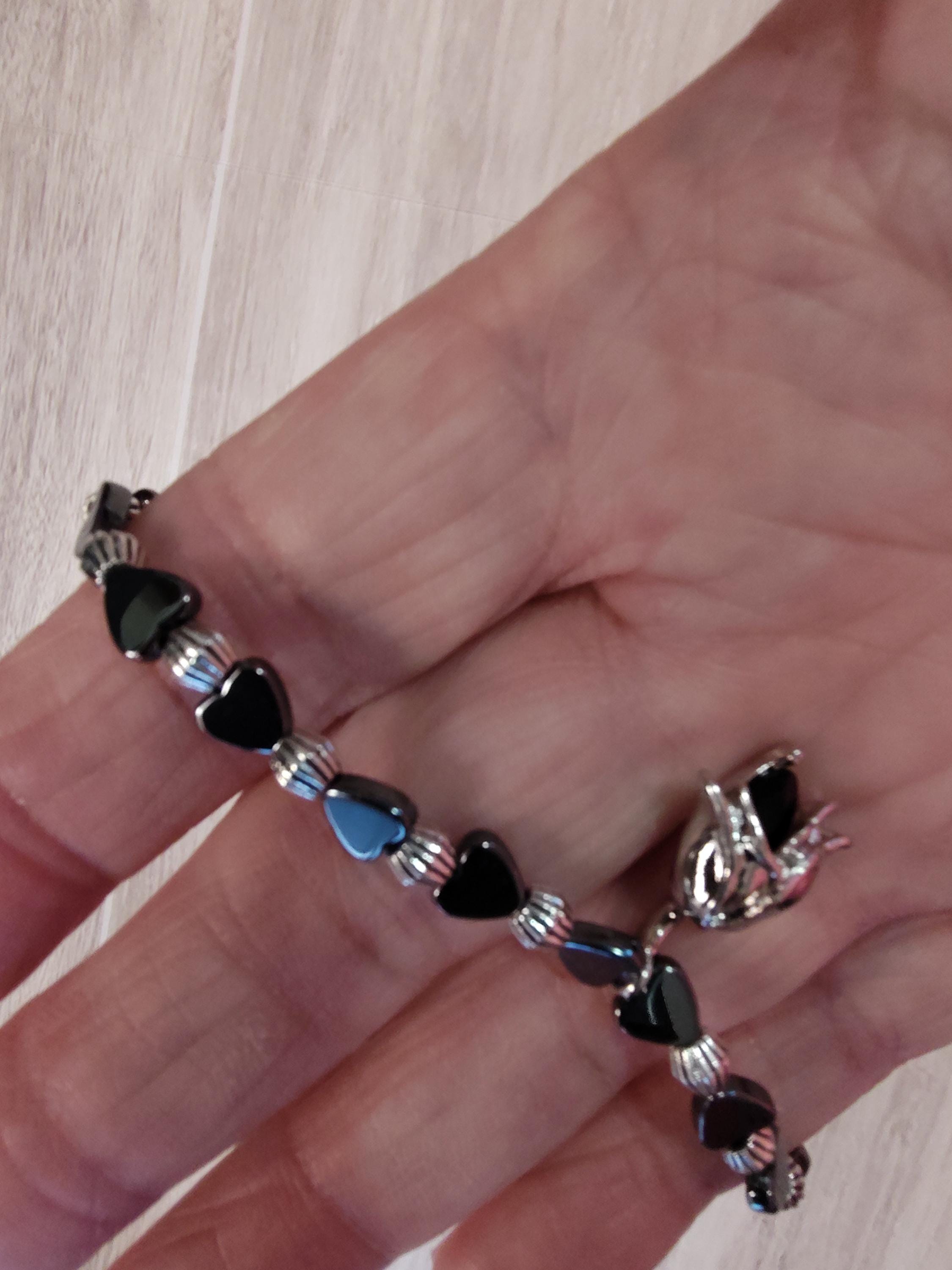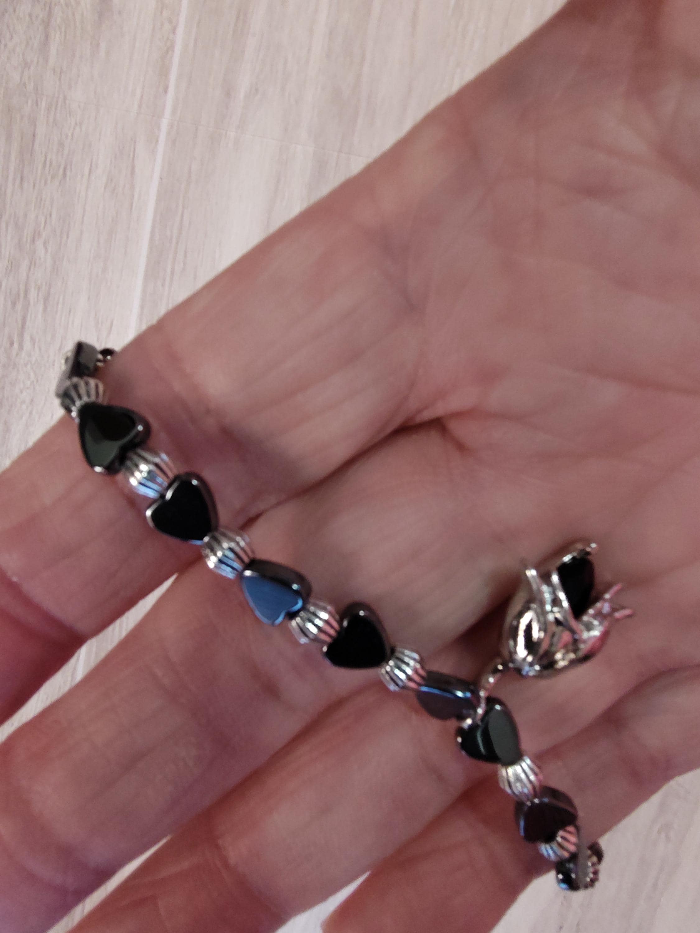 This dainty bracelet includes 5x5mm hematite hearts and a an elegant 20.5 x13mm black rose and silver dangle.
