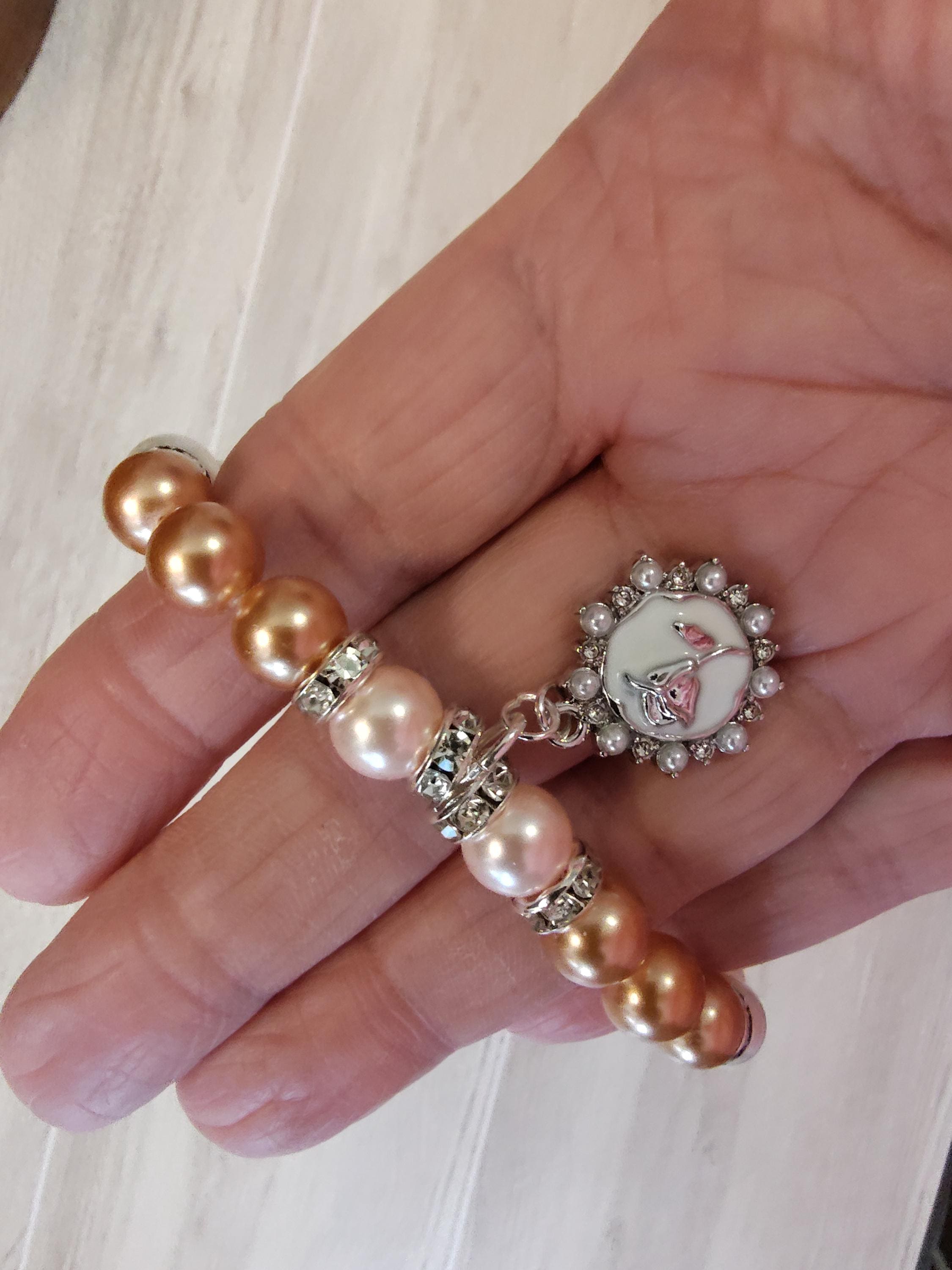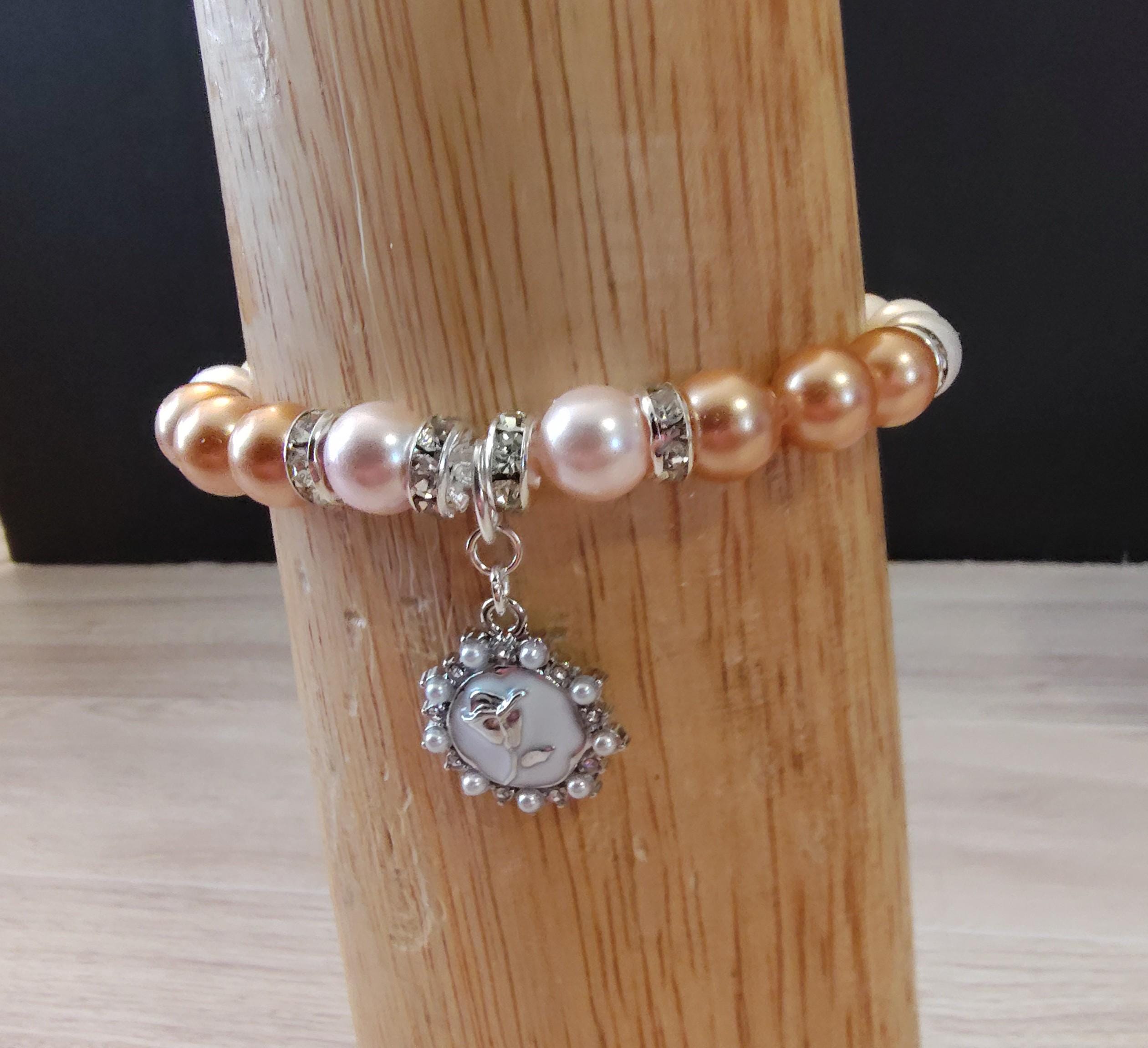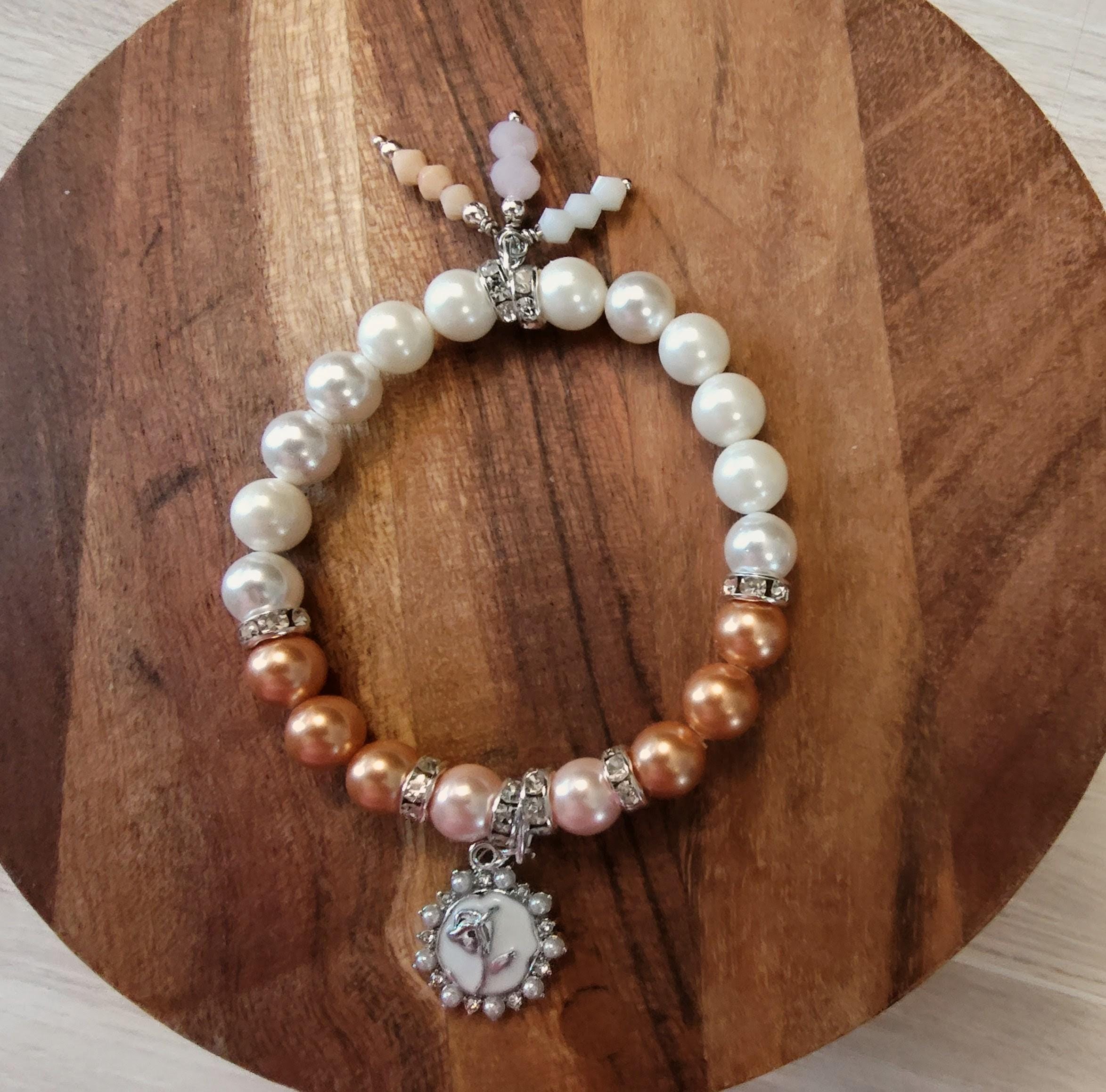 This kit includes 8mm luminescent shell pearls, 4mm clear glass crystals, and 4mm peach bicone crystals. It also features a 20 x 18mm enameled rose dangle.