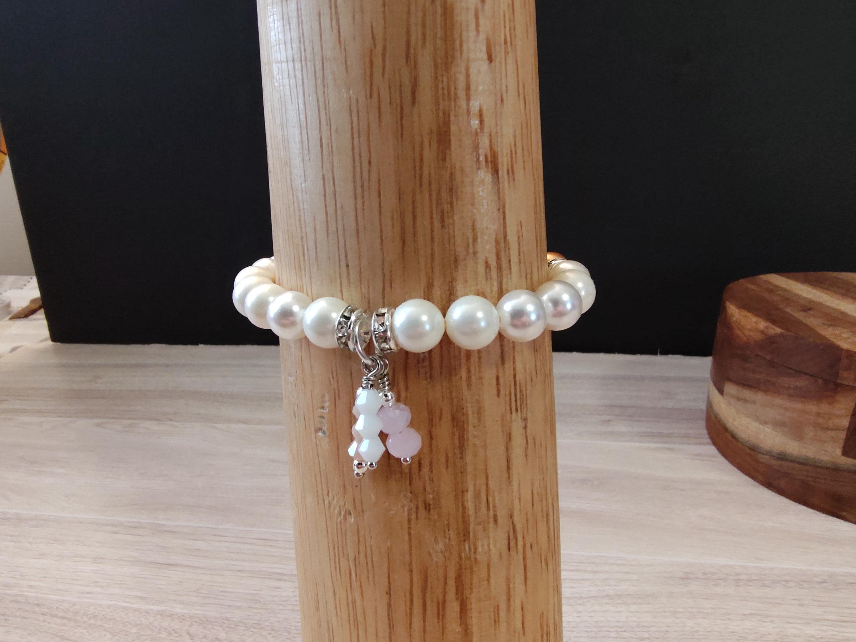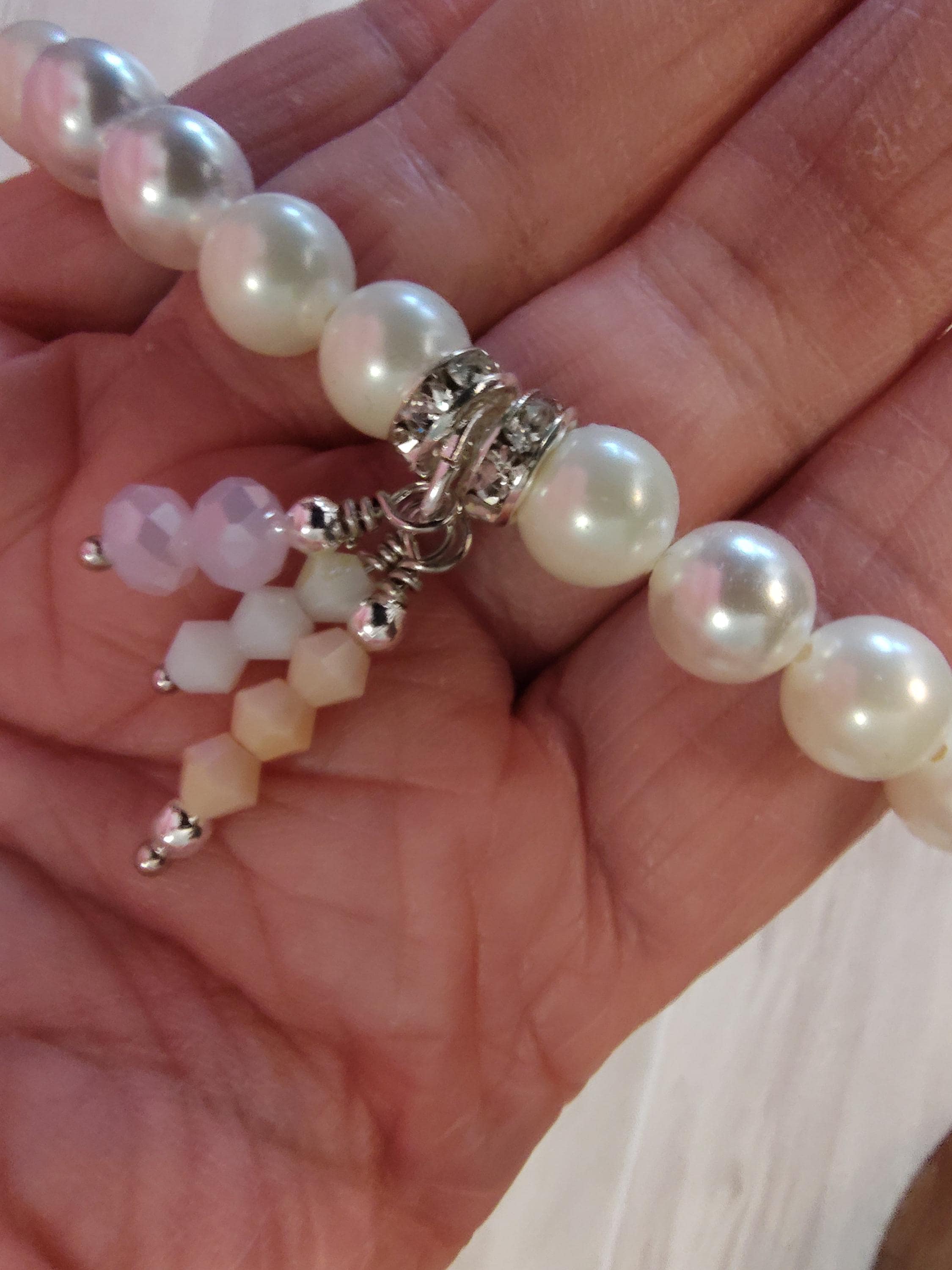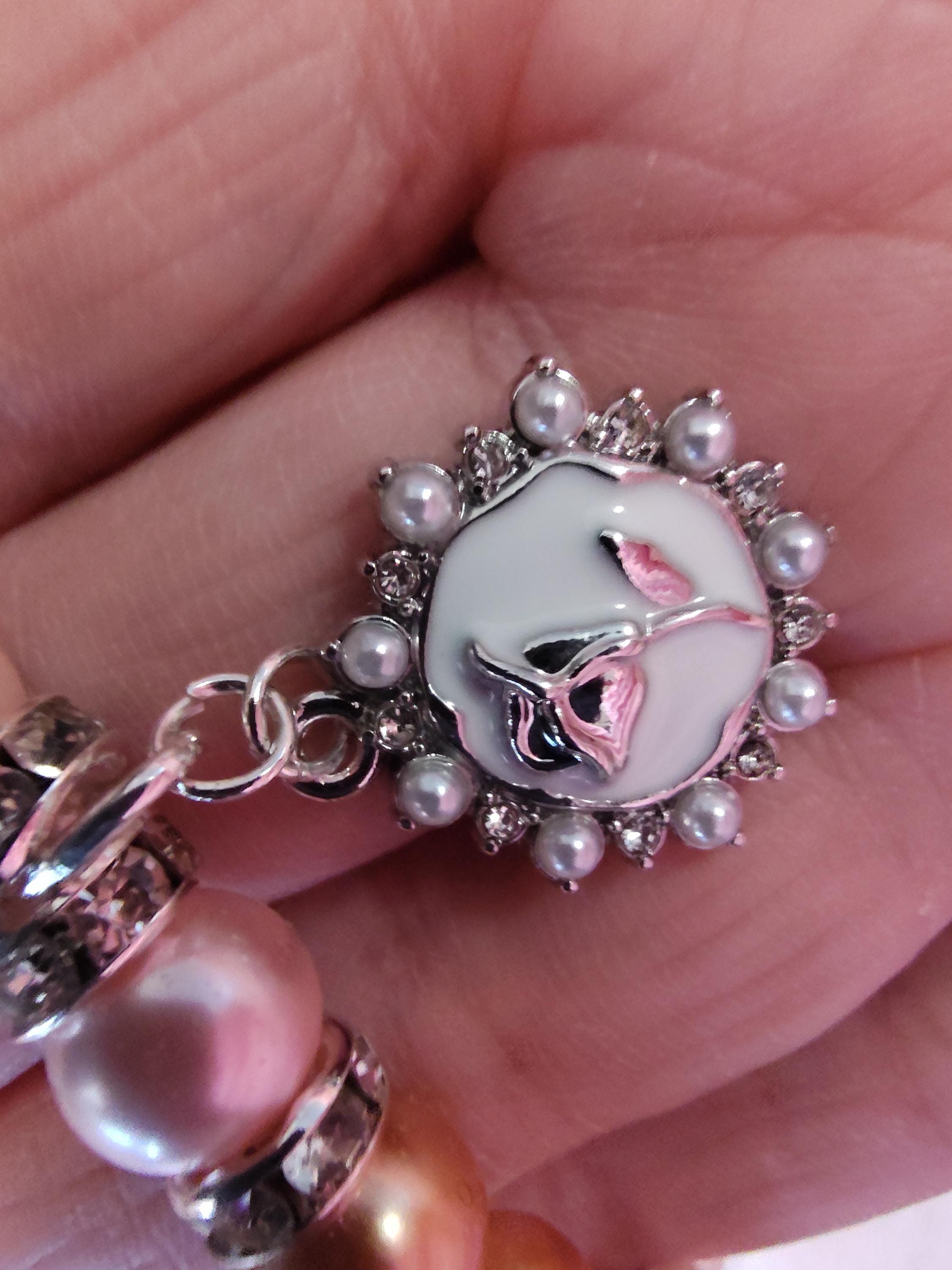 This kit includes 8mm luminescent shell pearls, 4mm clear glass crystals, and 4mm peach bicone crystals. It also features a 20 x 18mm enameled rose dangle.
